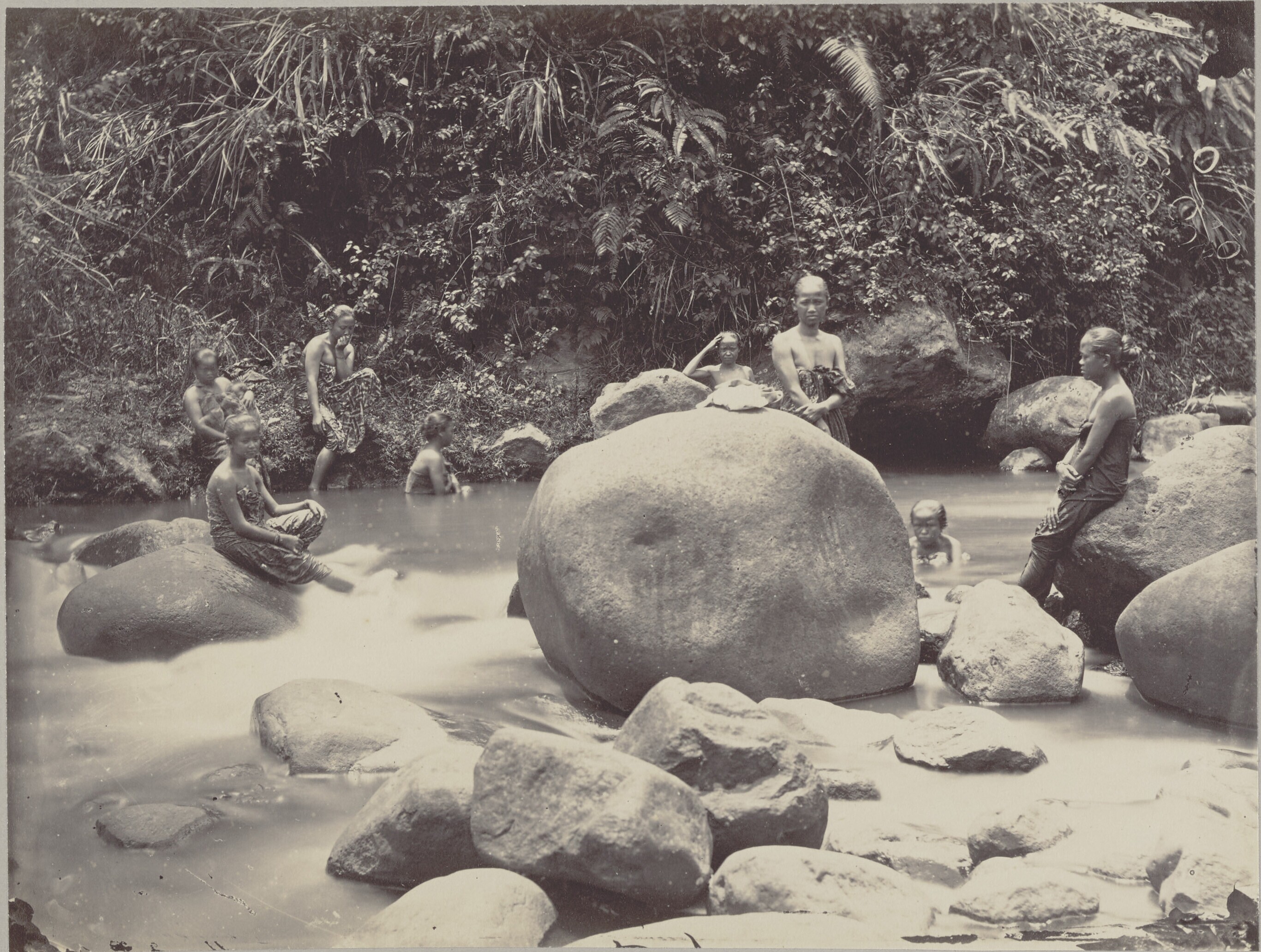 Vrouwen tijdens het baden in een rivier in de Preanger