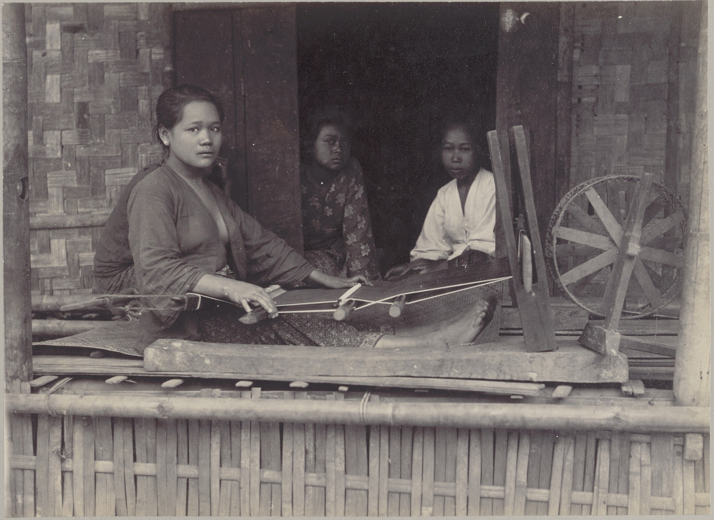 Een weefster achter een weeftoestel