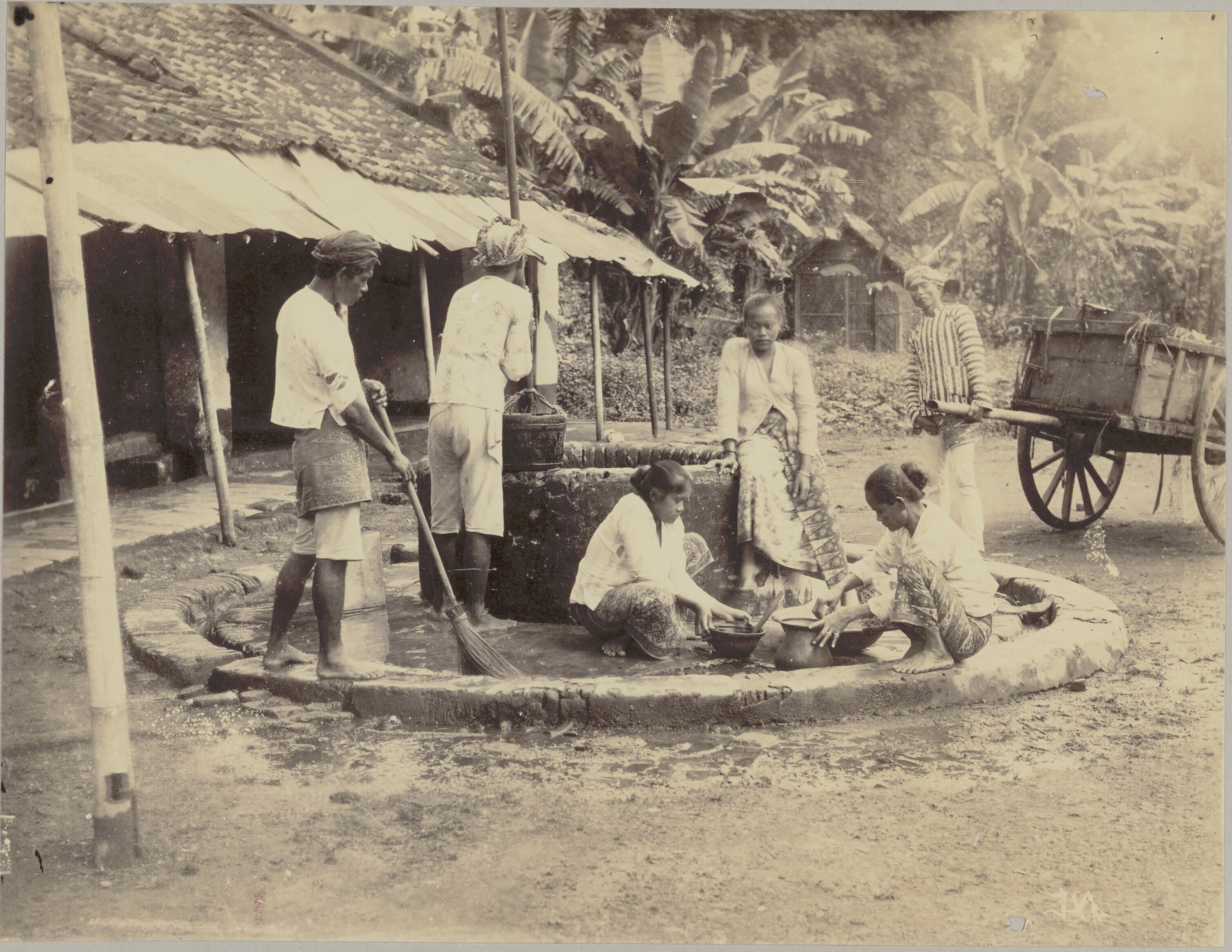 Bedrijvigheid rond een waterput bij een woonhuis in ...