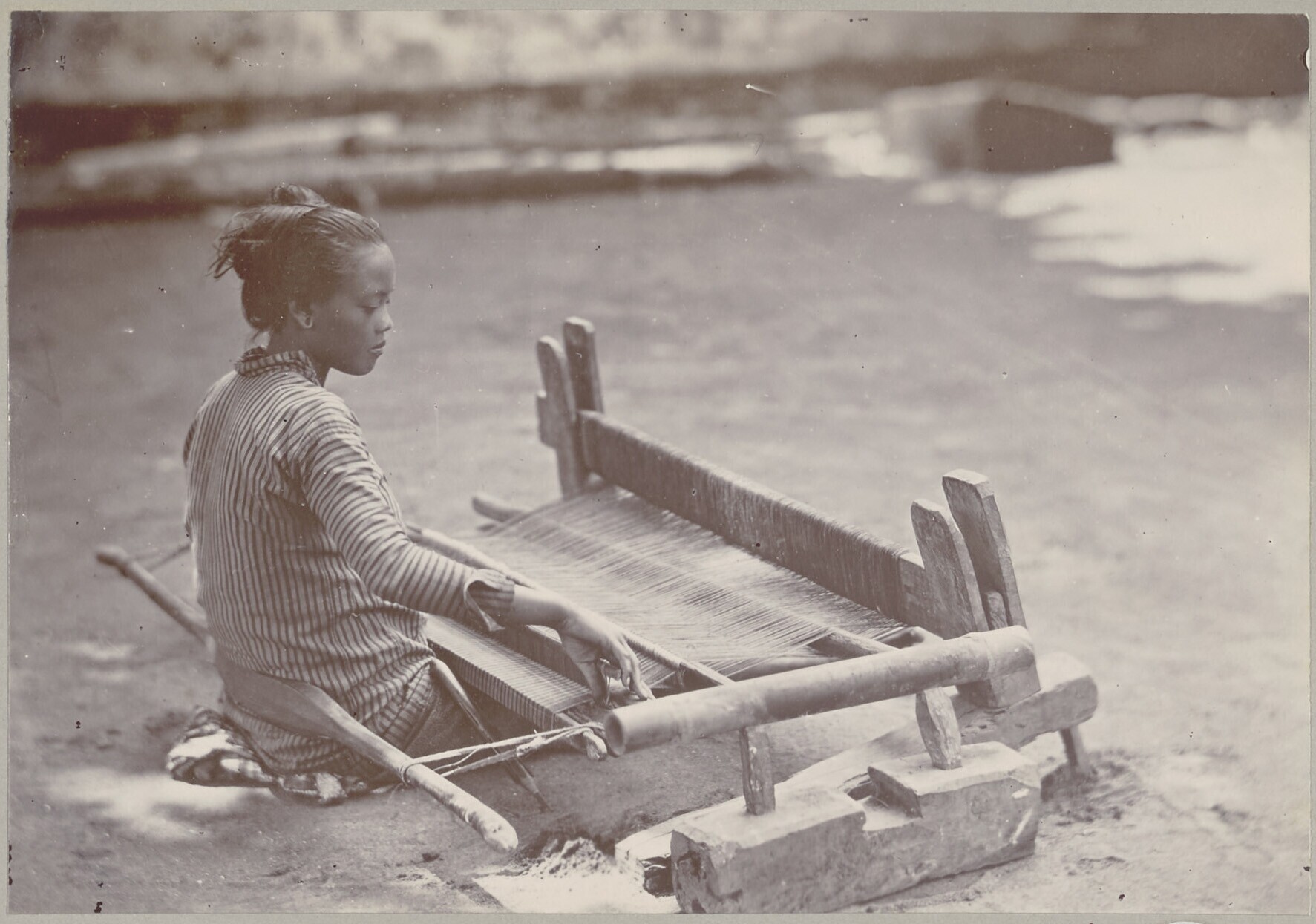 Een weefster achter een weeftoestel