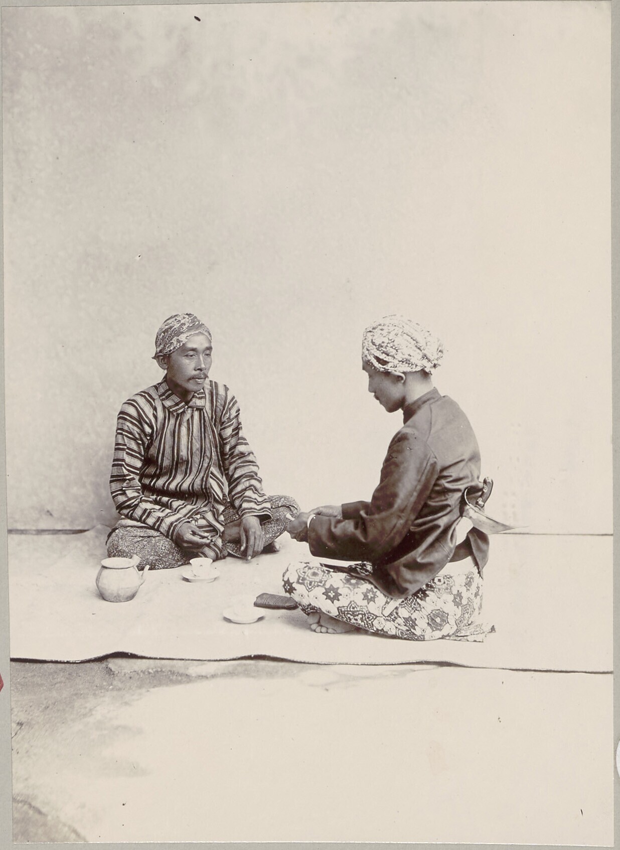 Studioportret van twee Javaanse mannen die thee drin...