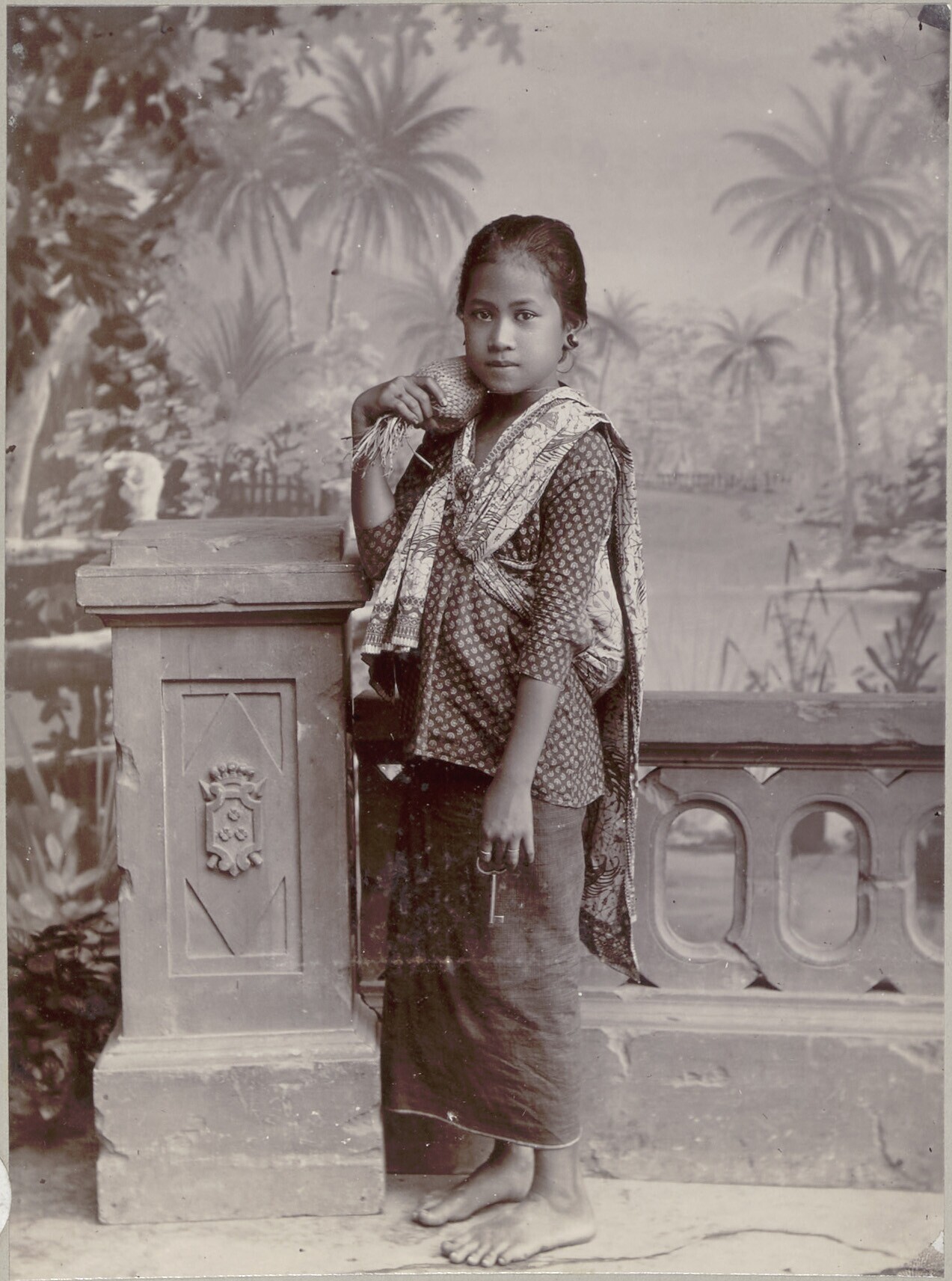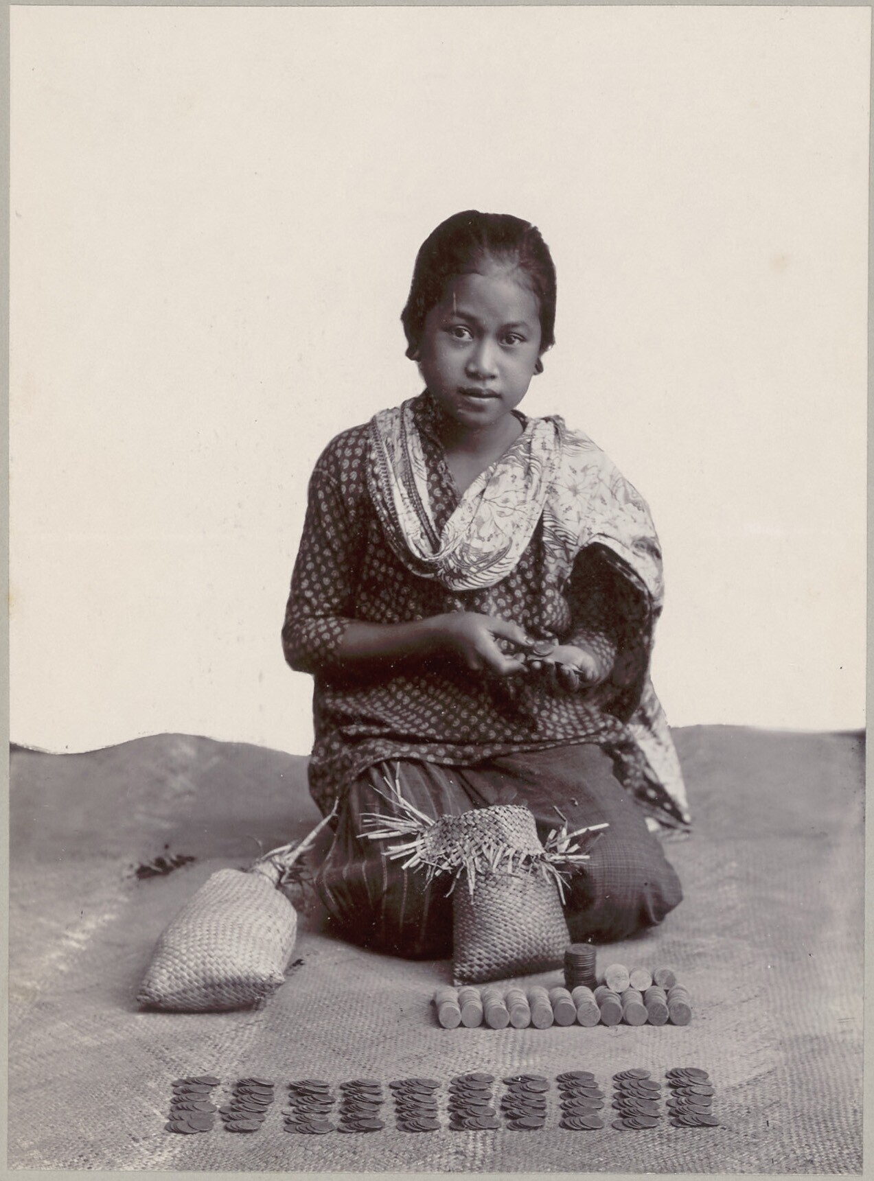 Studioportret van een jonge Javaanse geldwisselaarster
