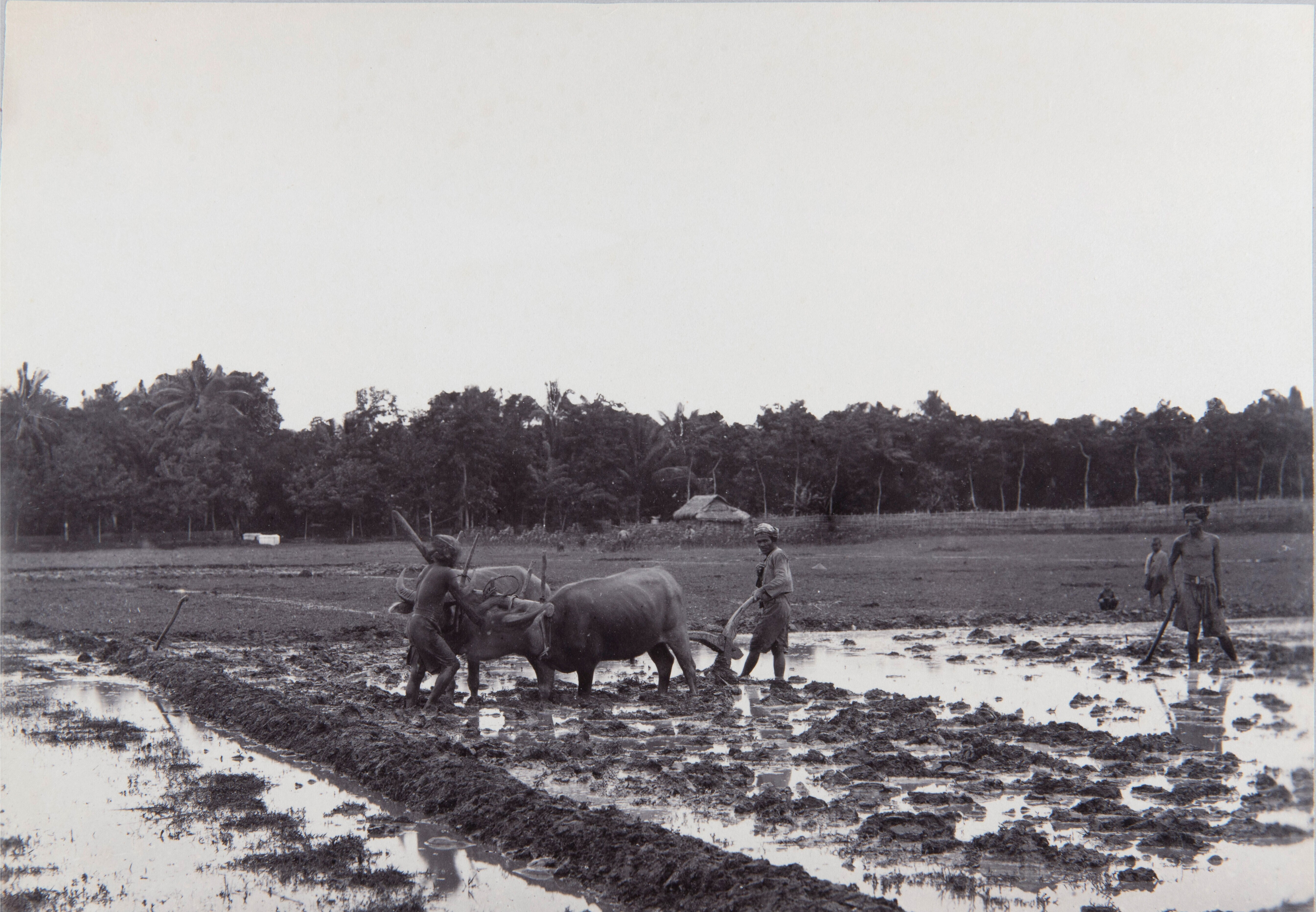 Een span karbouwen trekt een ploeg door een nat rijs...