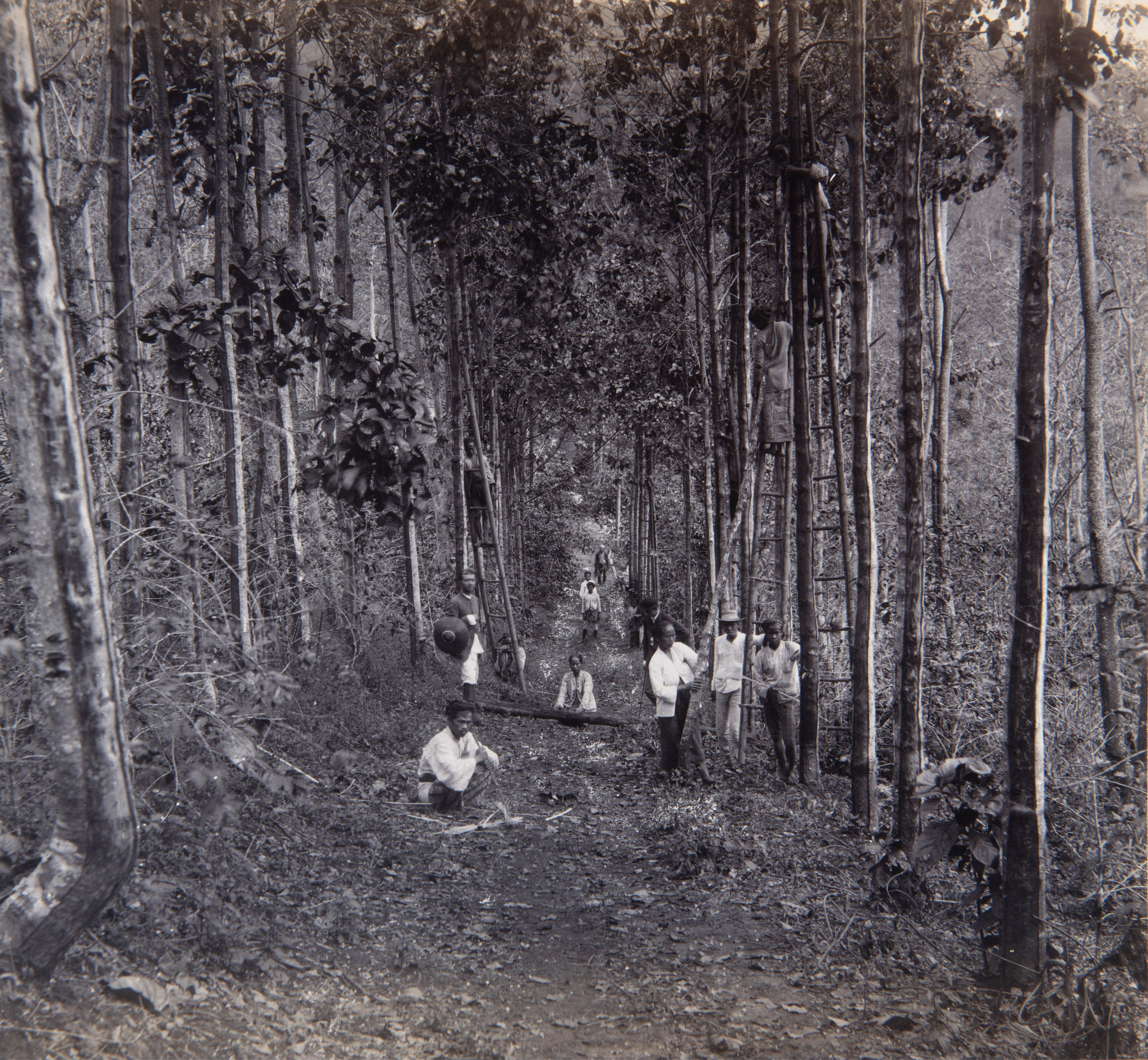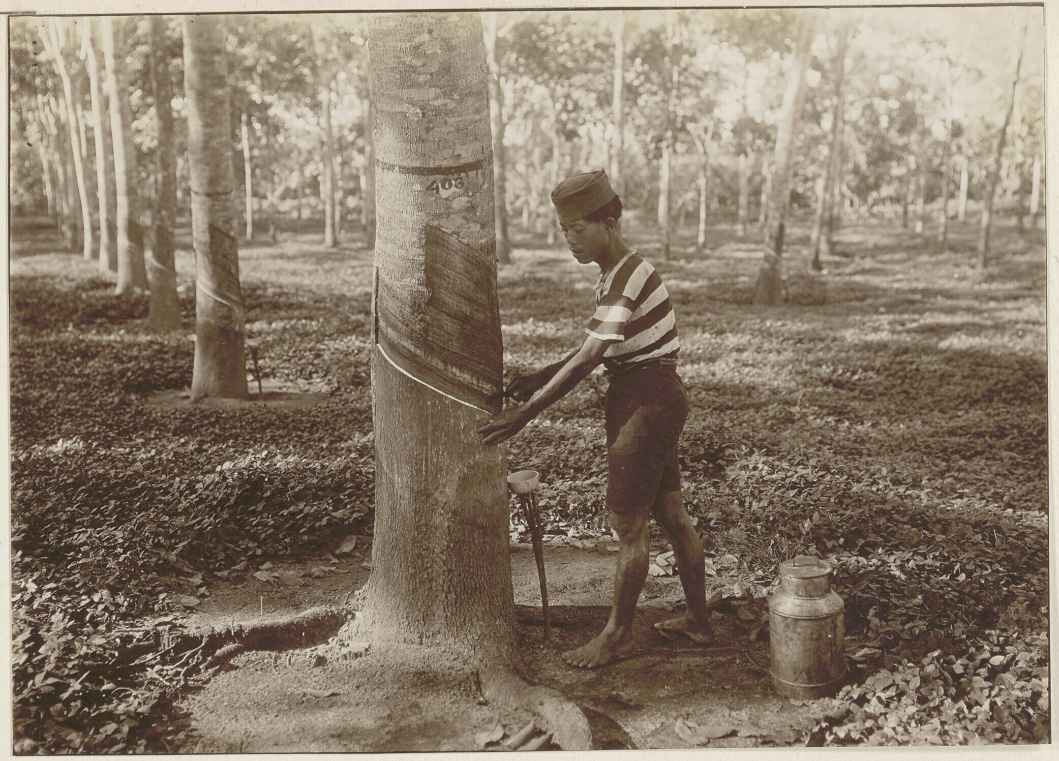 Rubbertap op een rubberonderneming op Oost-Sumatra