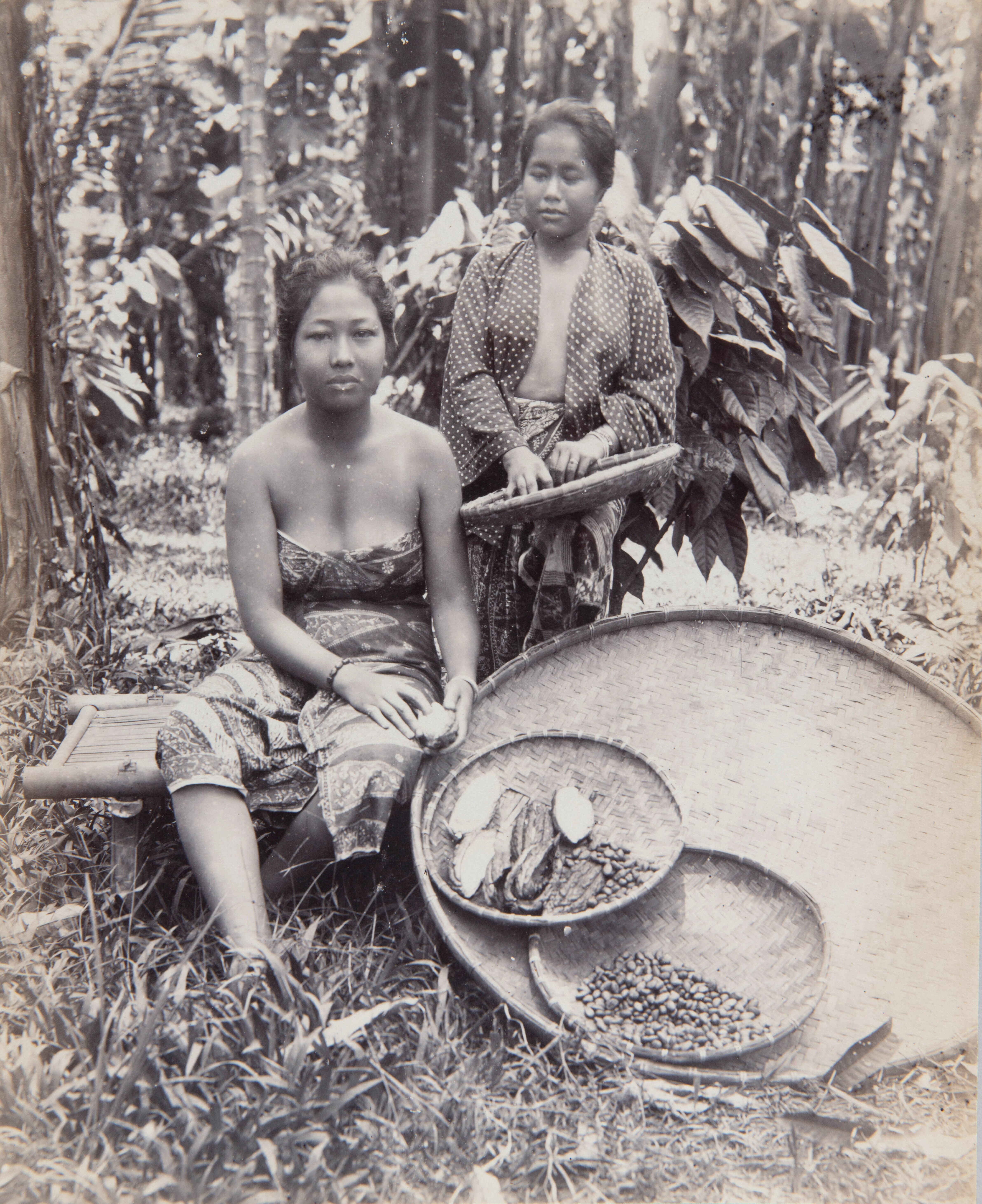 Groepsportret van twee vrouwen die de cacaobonen uit...