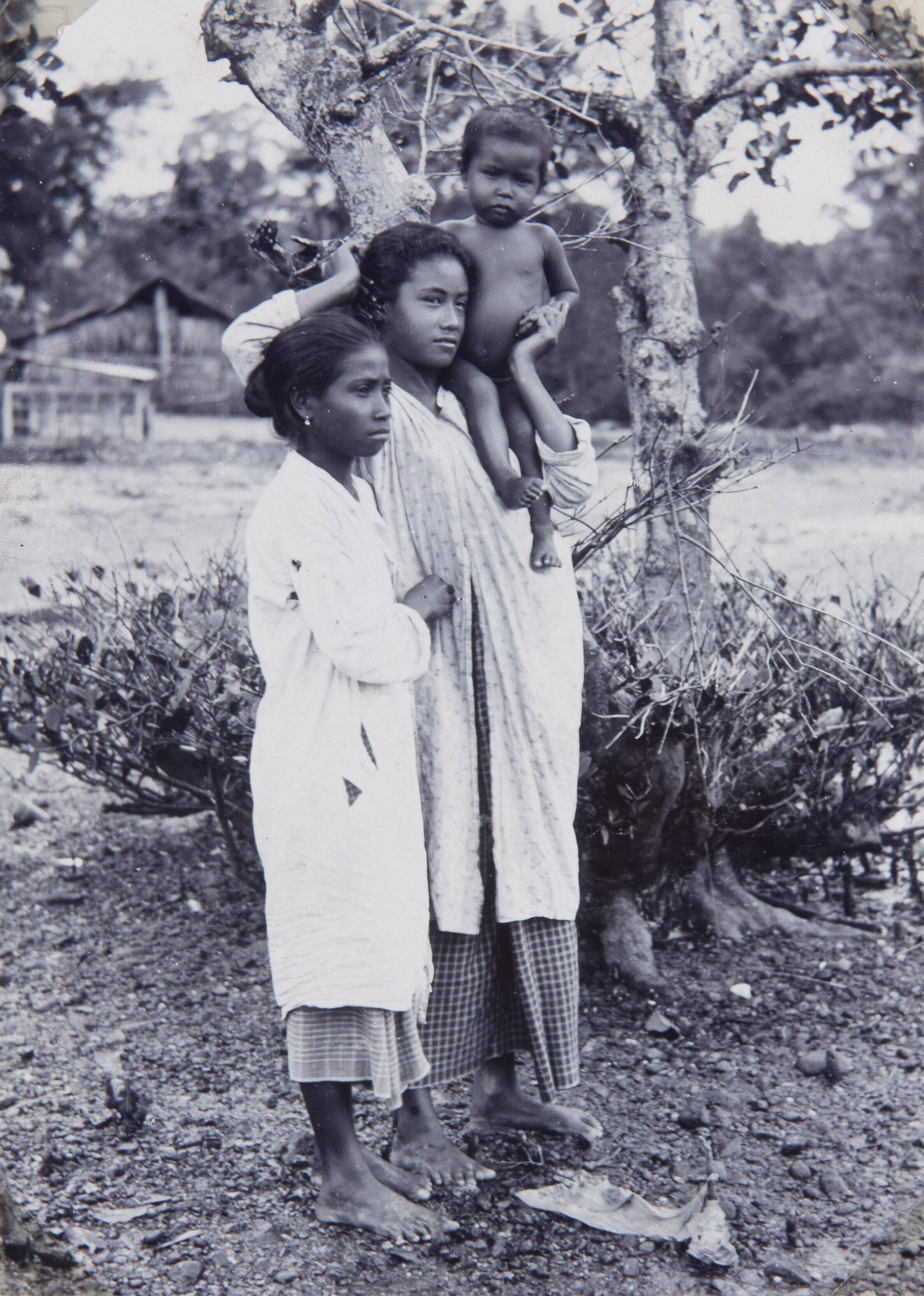 Groepsportret van twee Javaanse vrouwen met een klei...