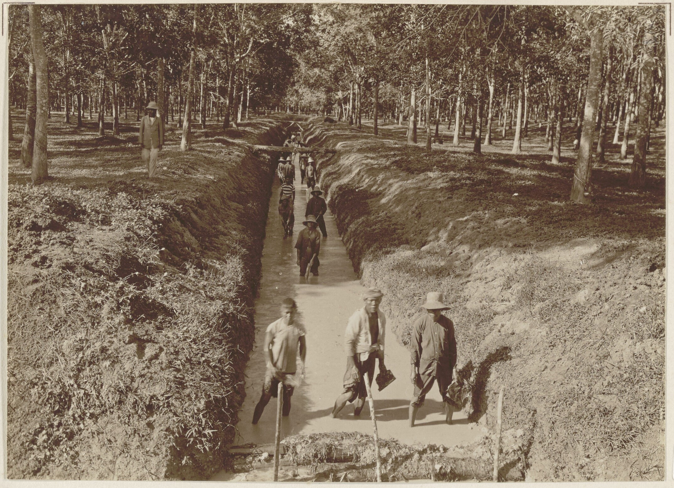 Het uitdiepen van een drainage kanaal op een rubbero...