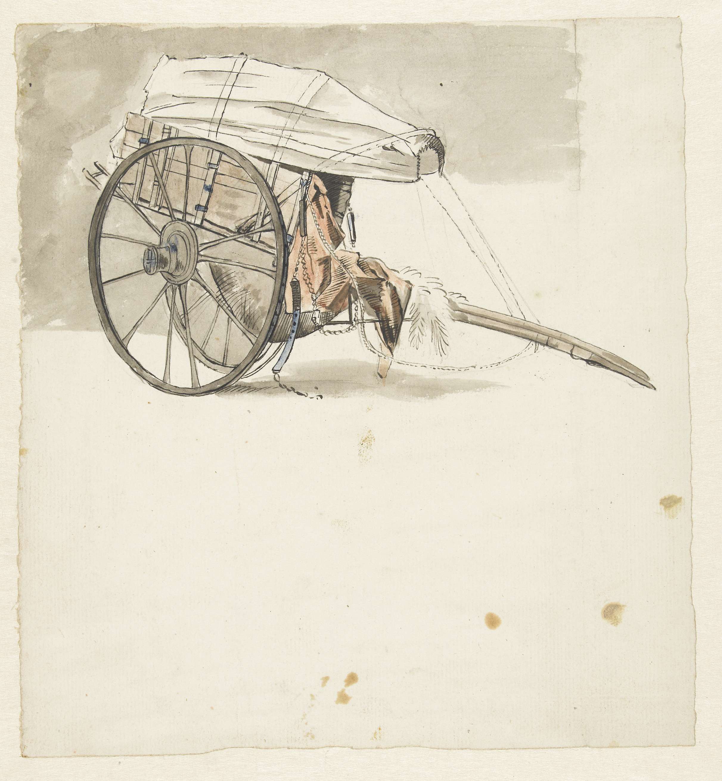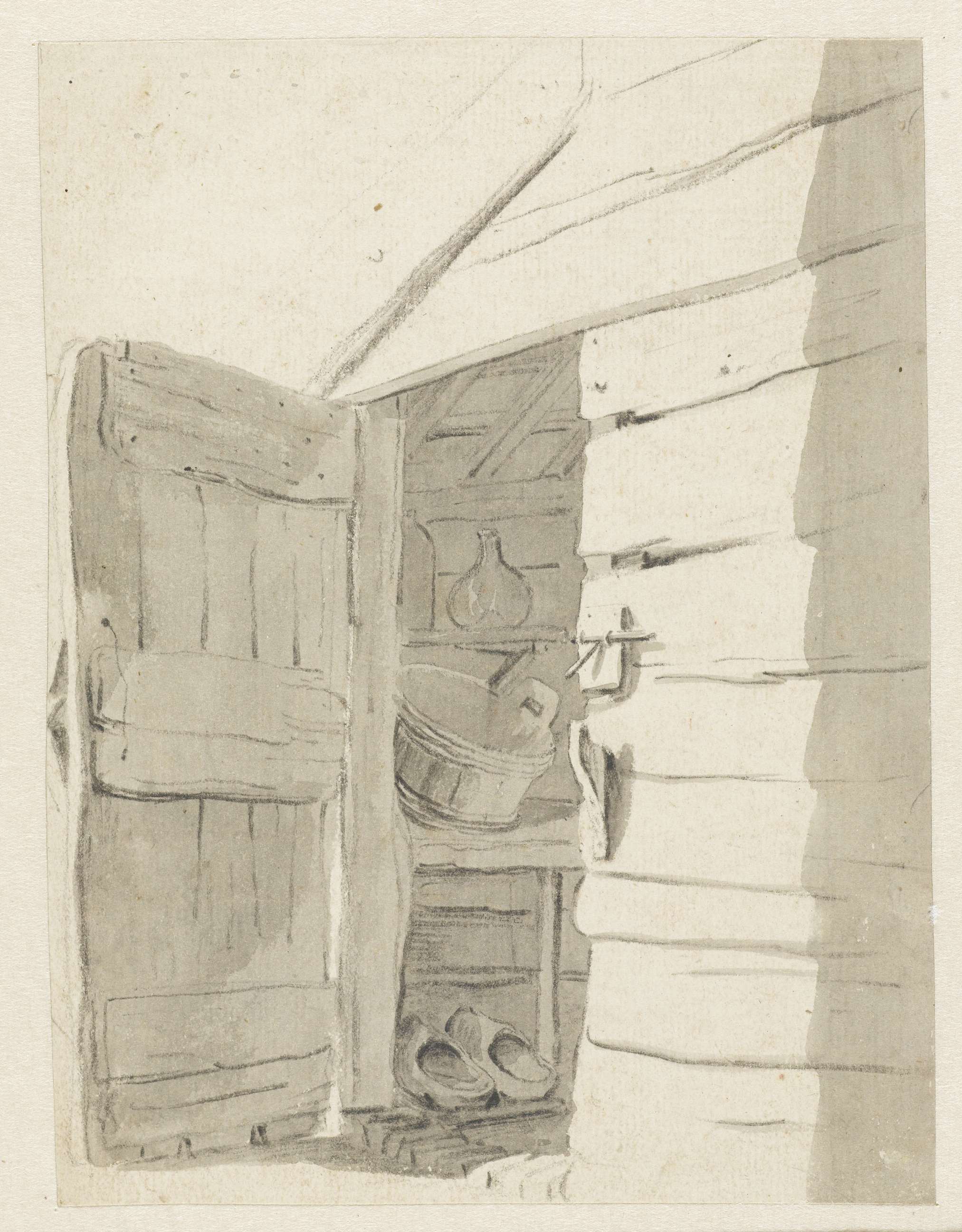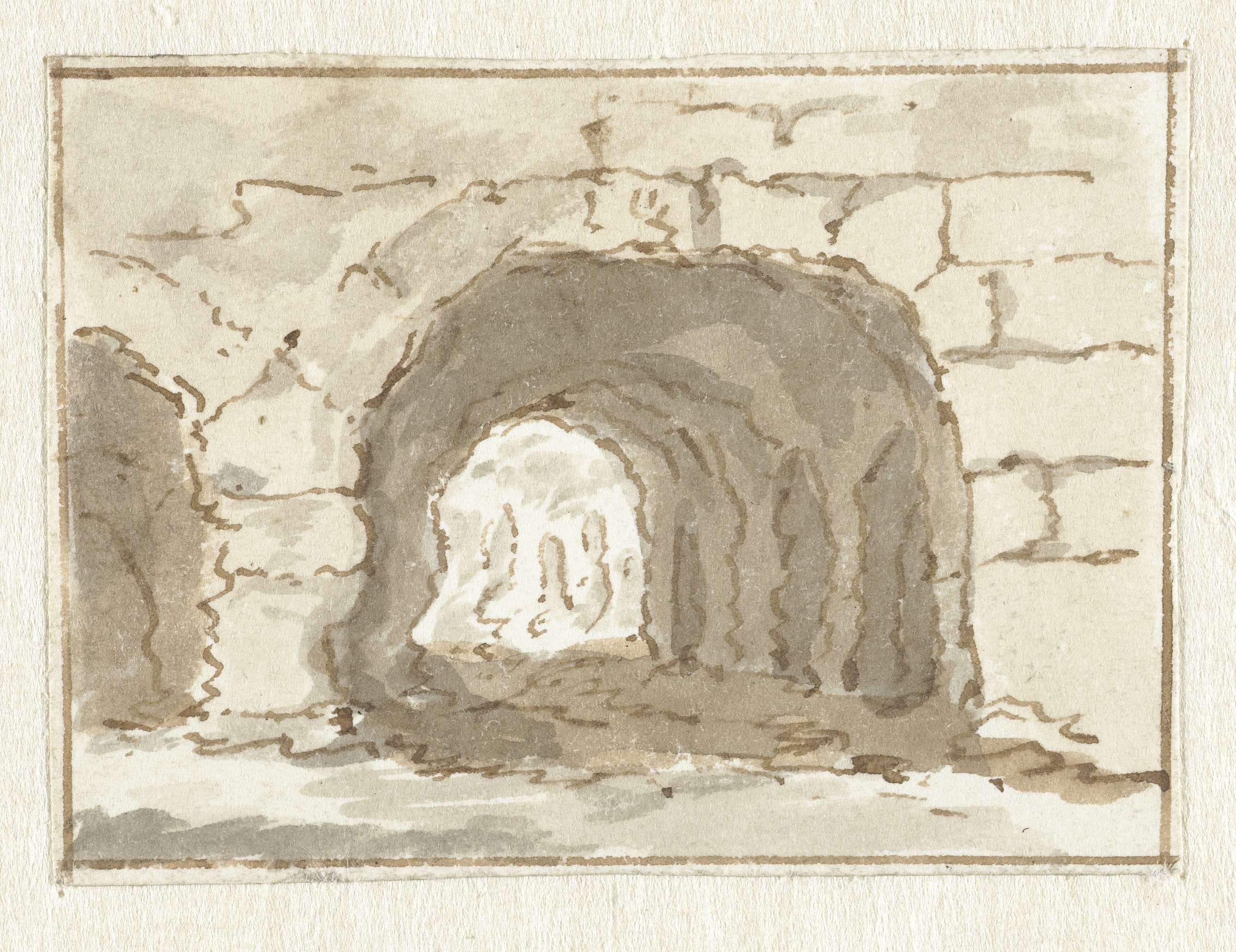 Vervallen gebouw met rechts een houtsprokkelaarster