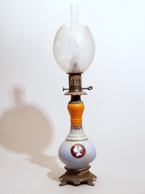 Bloemhouder met decor van blauw fond waarop witte ap...
