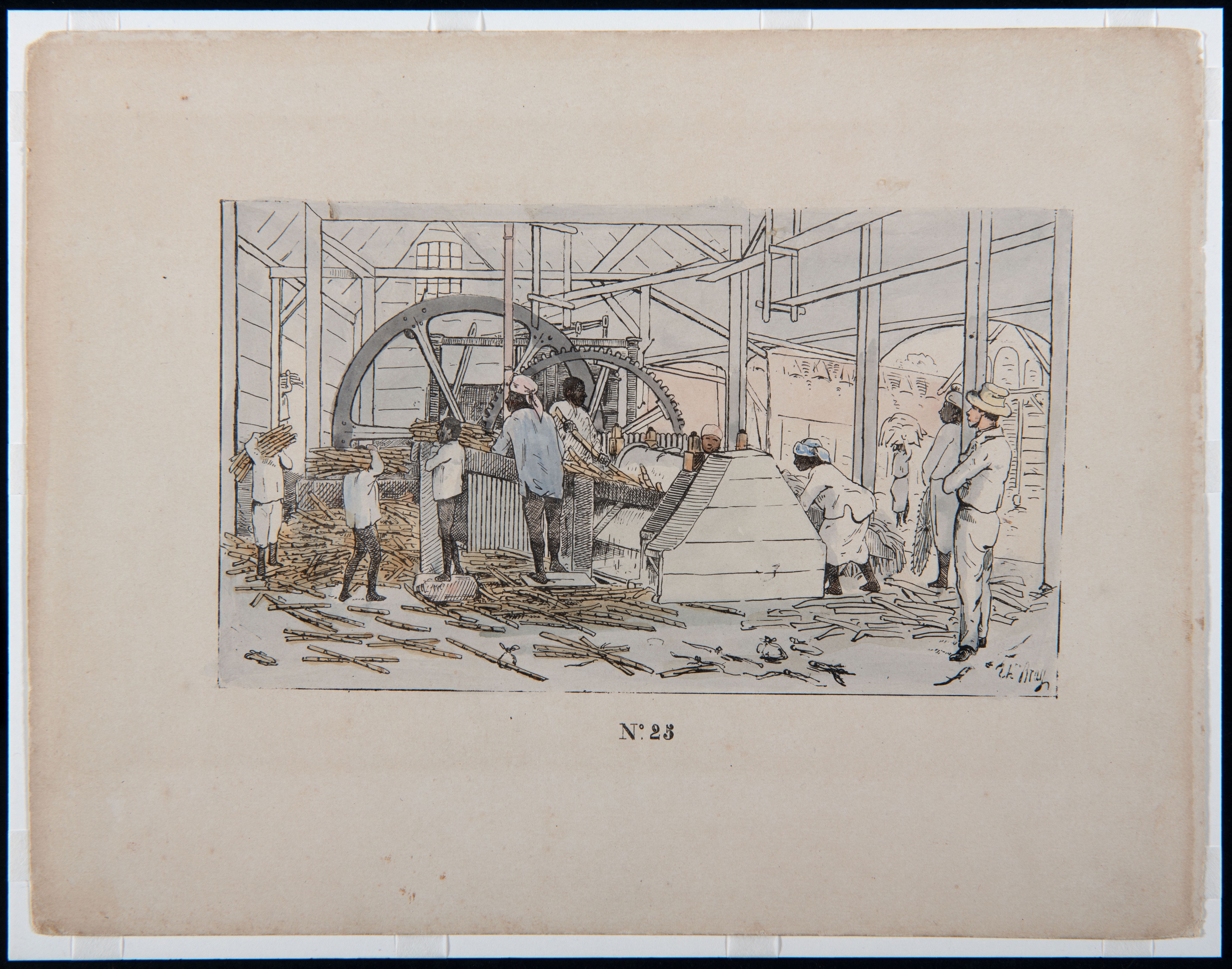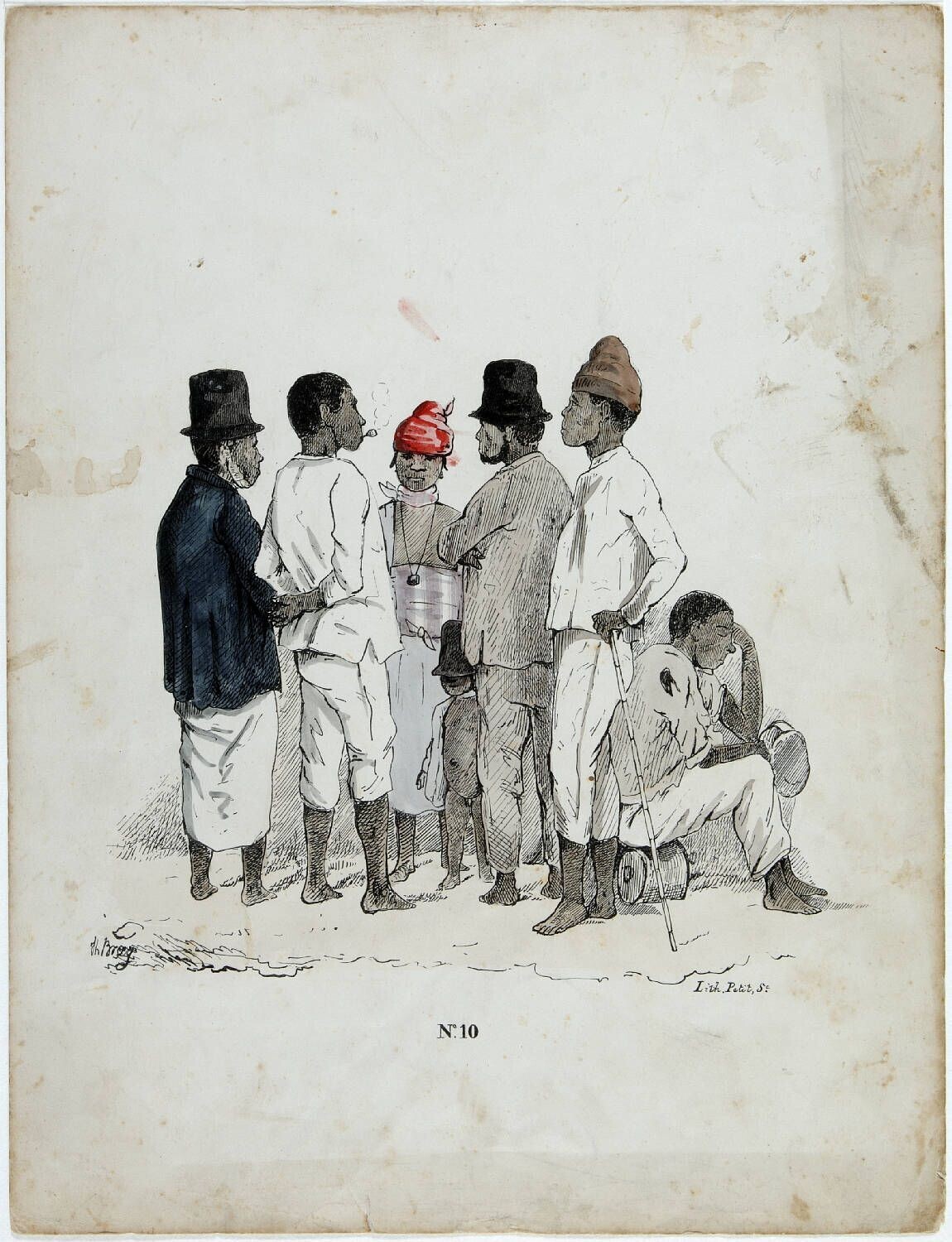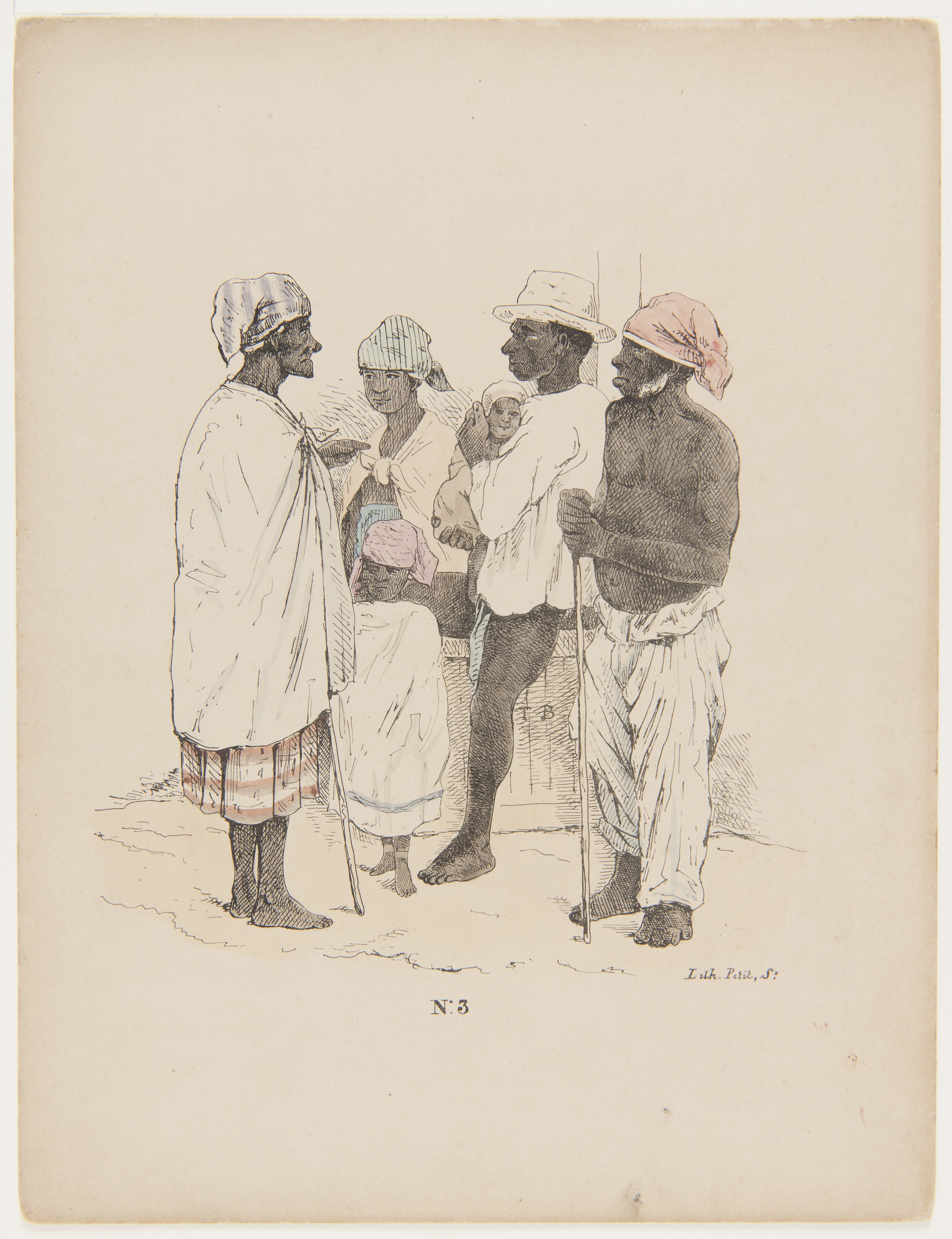 Ingekleurde litho van een zittende tot slaaf gemaakt...