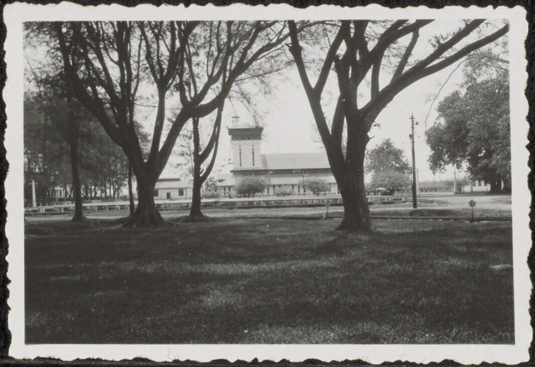 Gezicht op een ijsfabriek, met op de voorgrond bomen