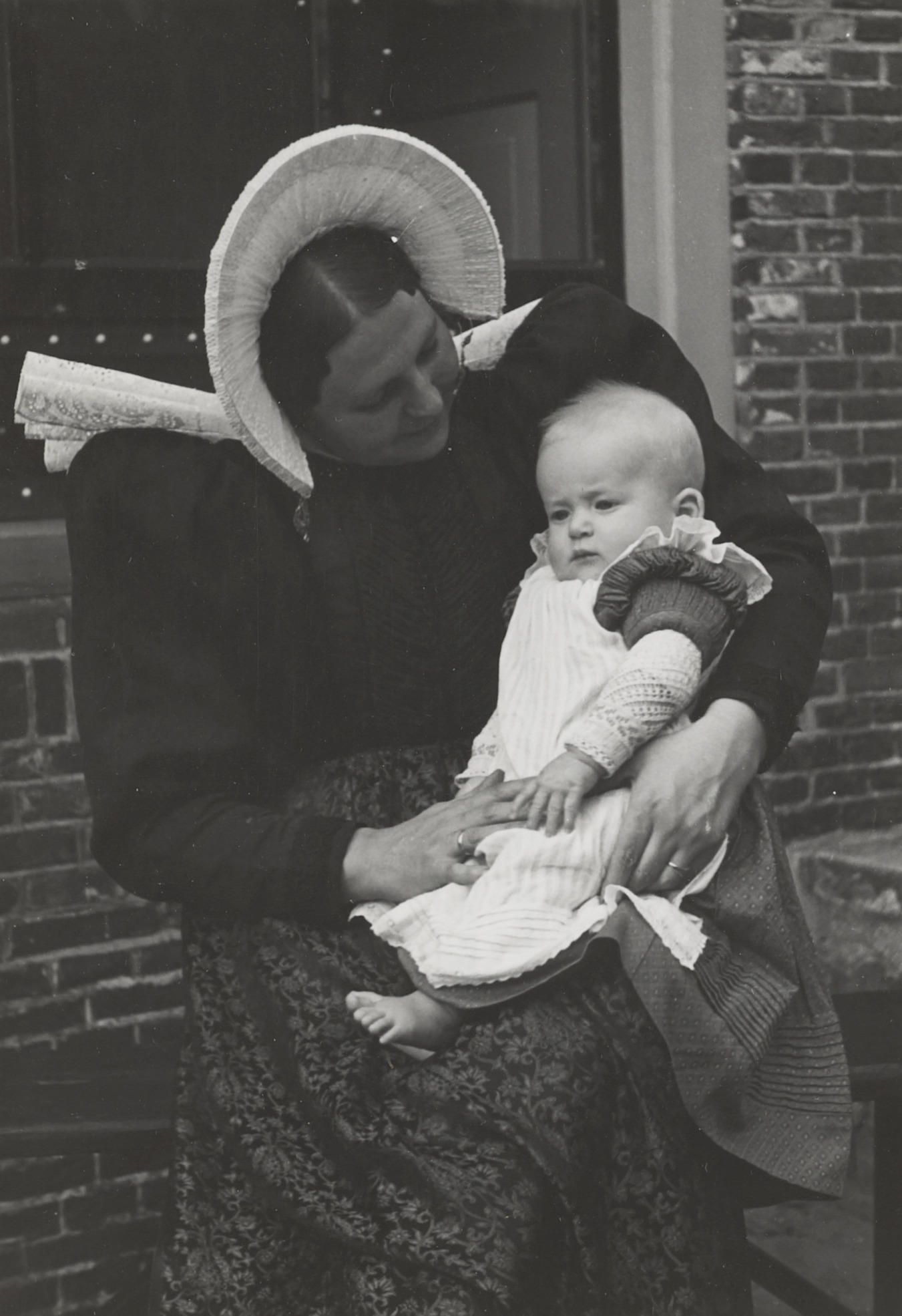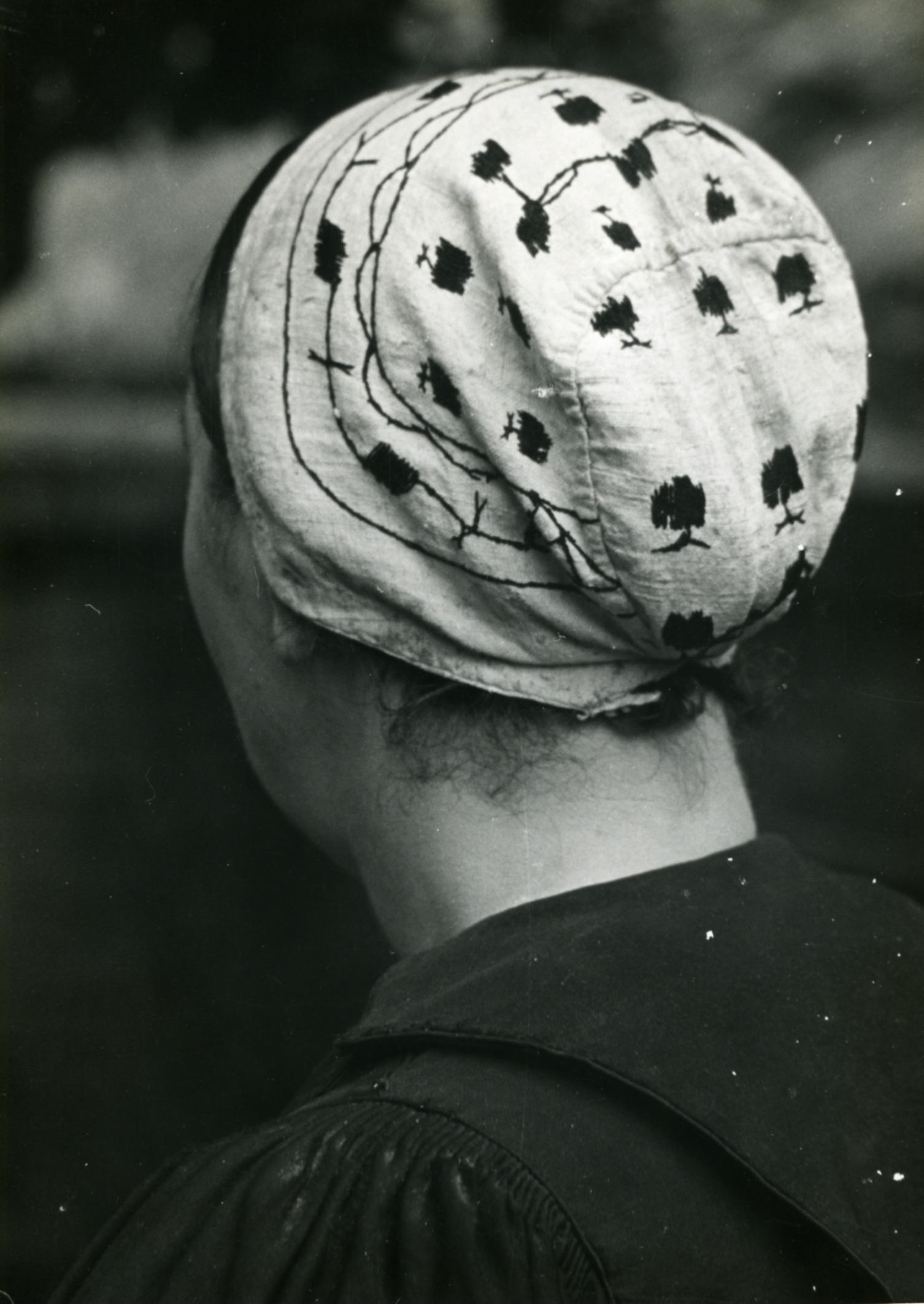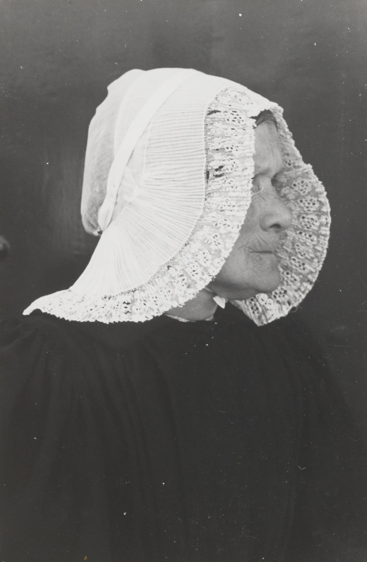 Geborduurde ondermuts, Huizen, 1945 (zwart-wit foto)