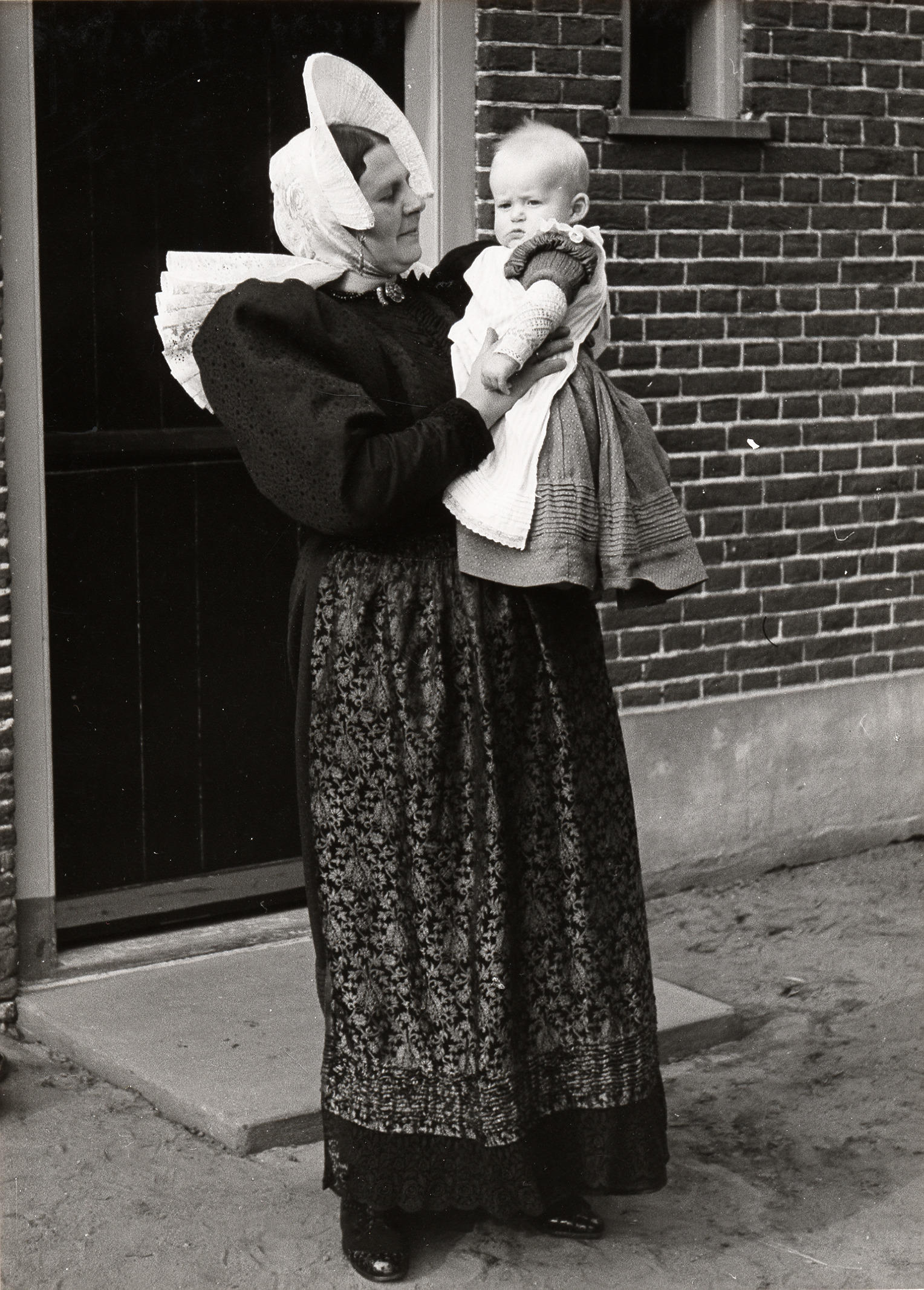 Vrouw en jongetje in streekdracht, Huizen, 1945 (zwa...