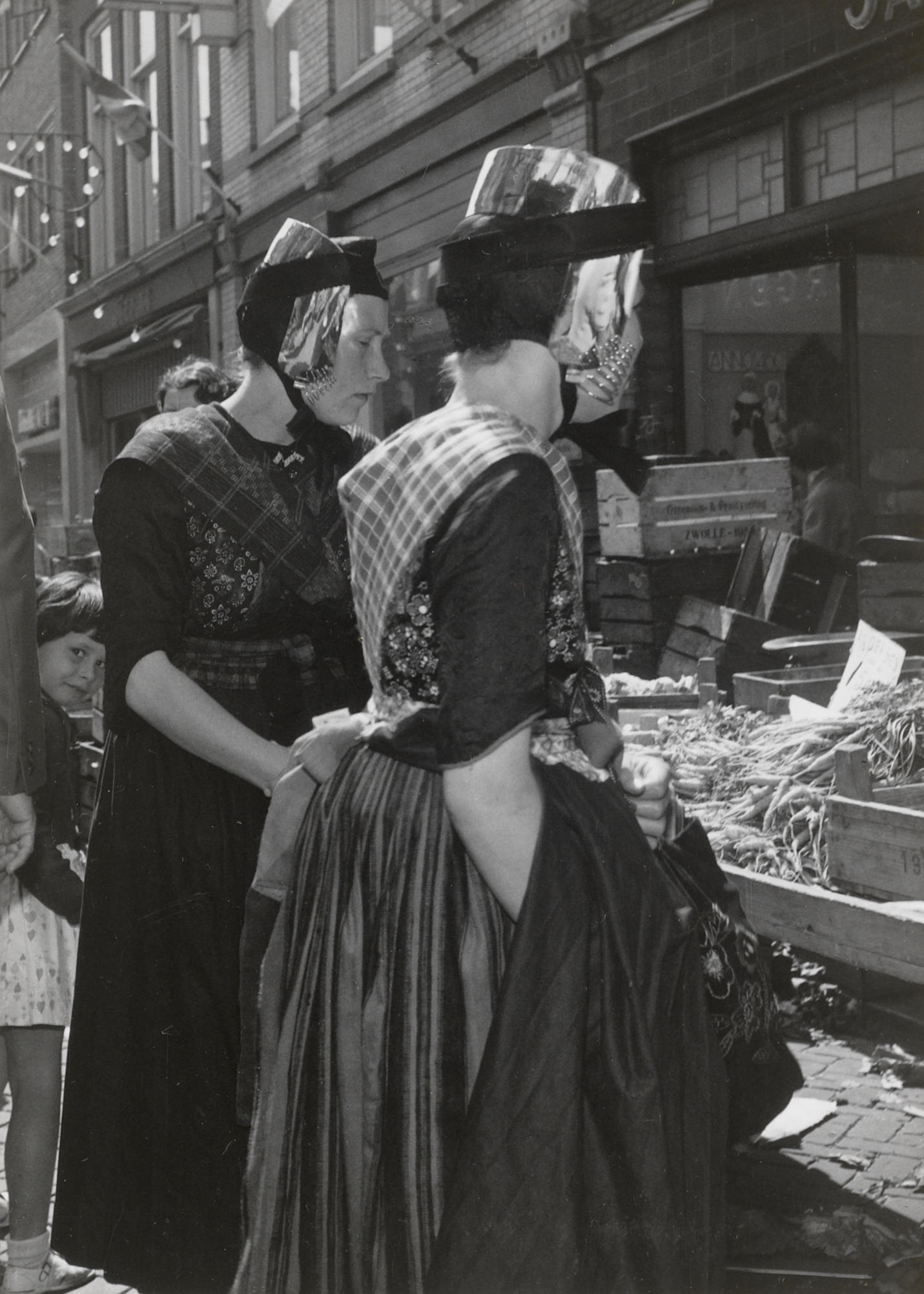 Vrouwen in Staphorster dracht op de markt, Meppel, 1...