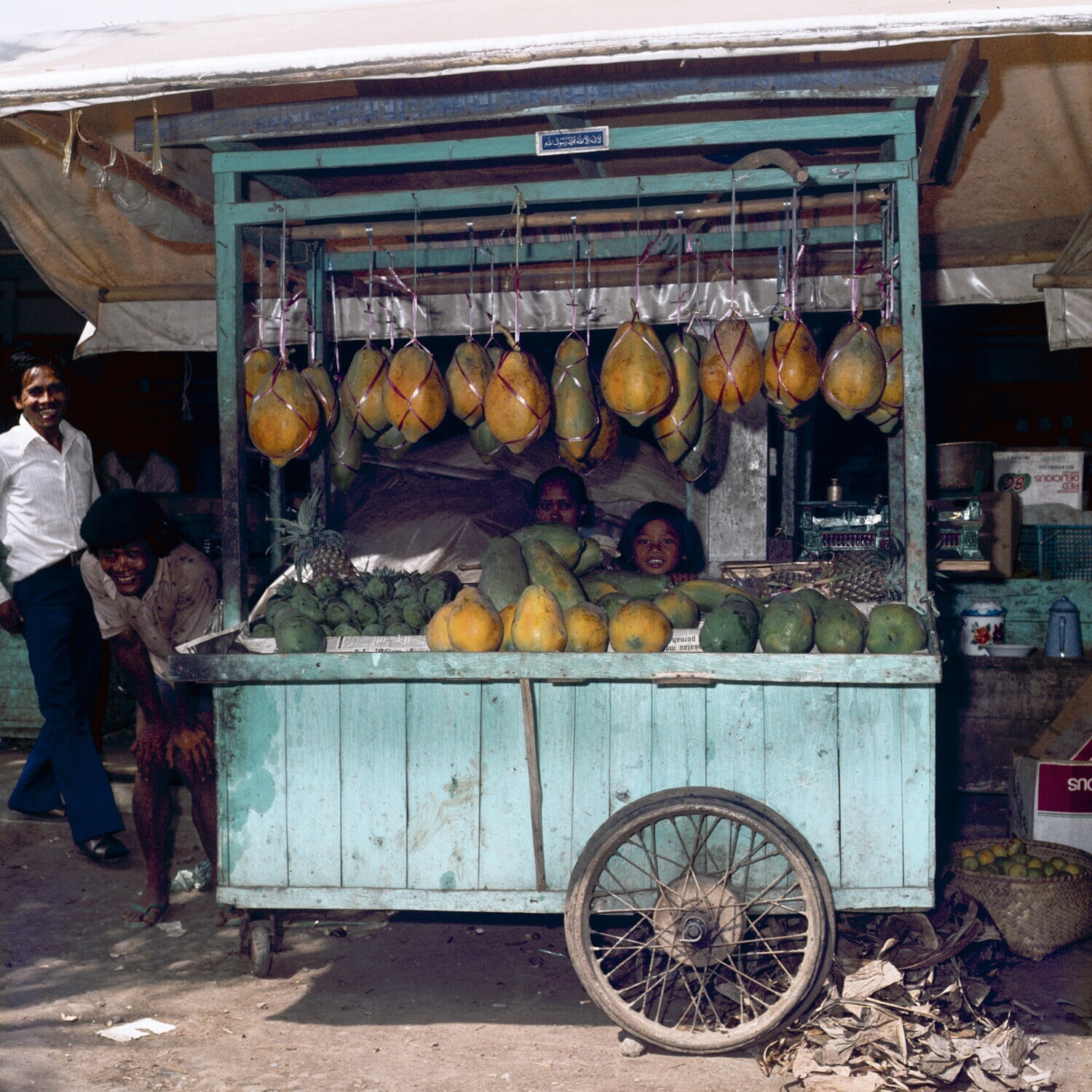 Pasar Purwakarta. Rijdende fruitstal met papaya en g...