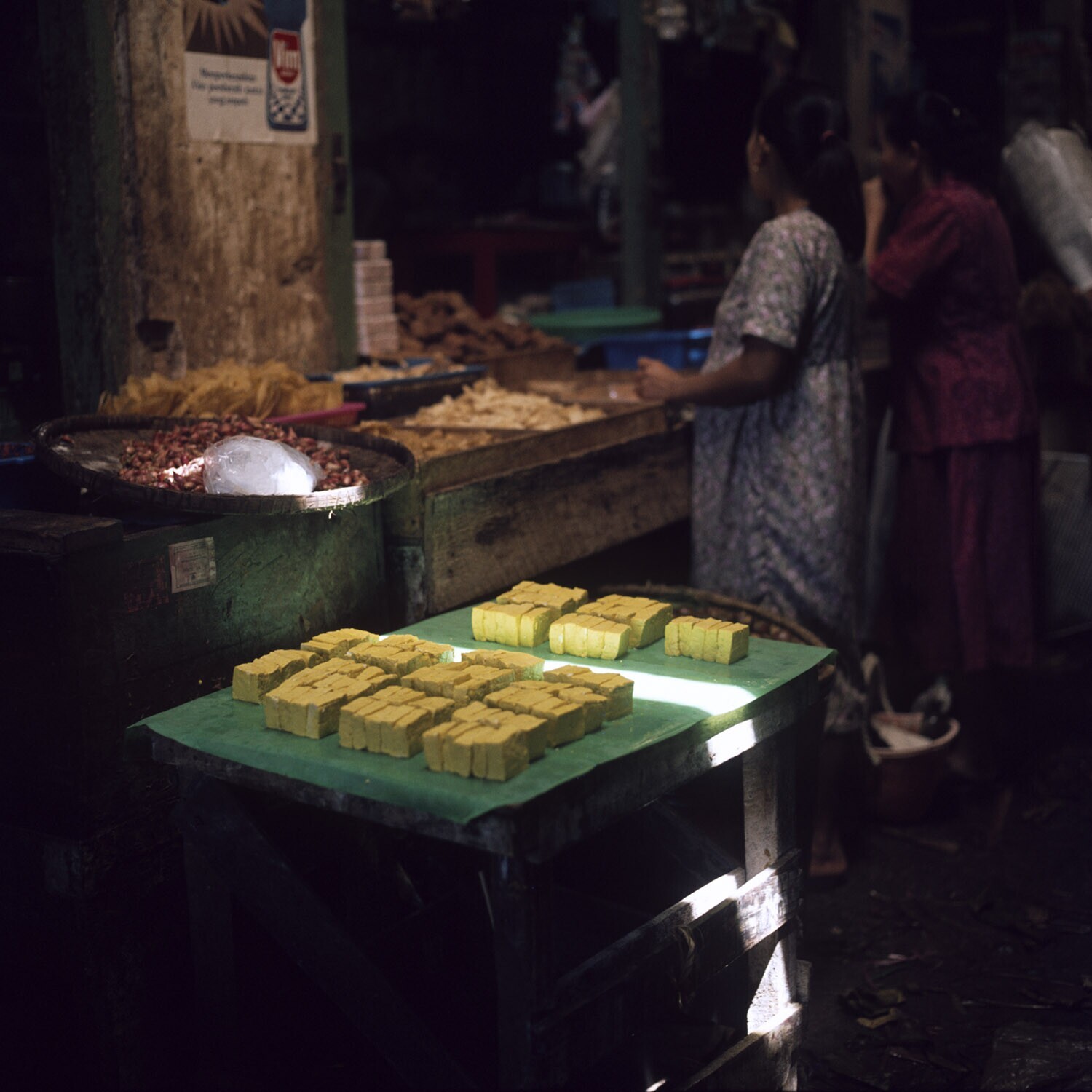 Blokken verse tahu op de pasar Kosambi, Bandung.