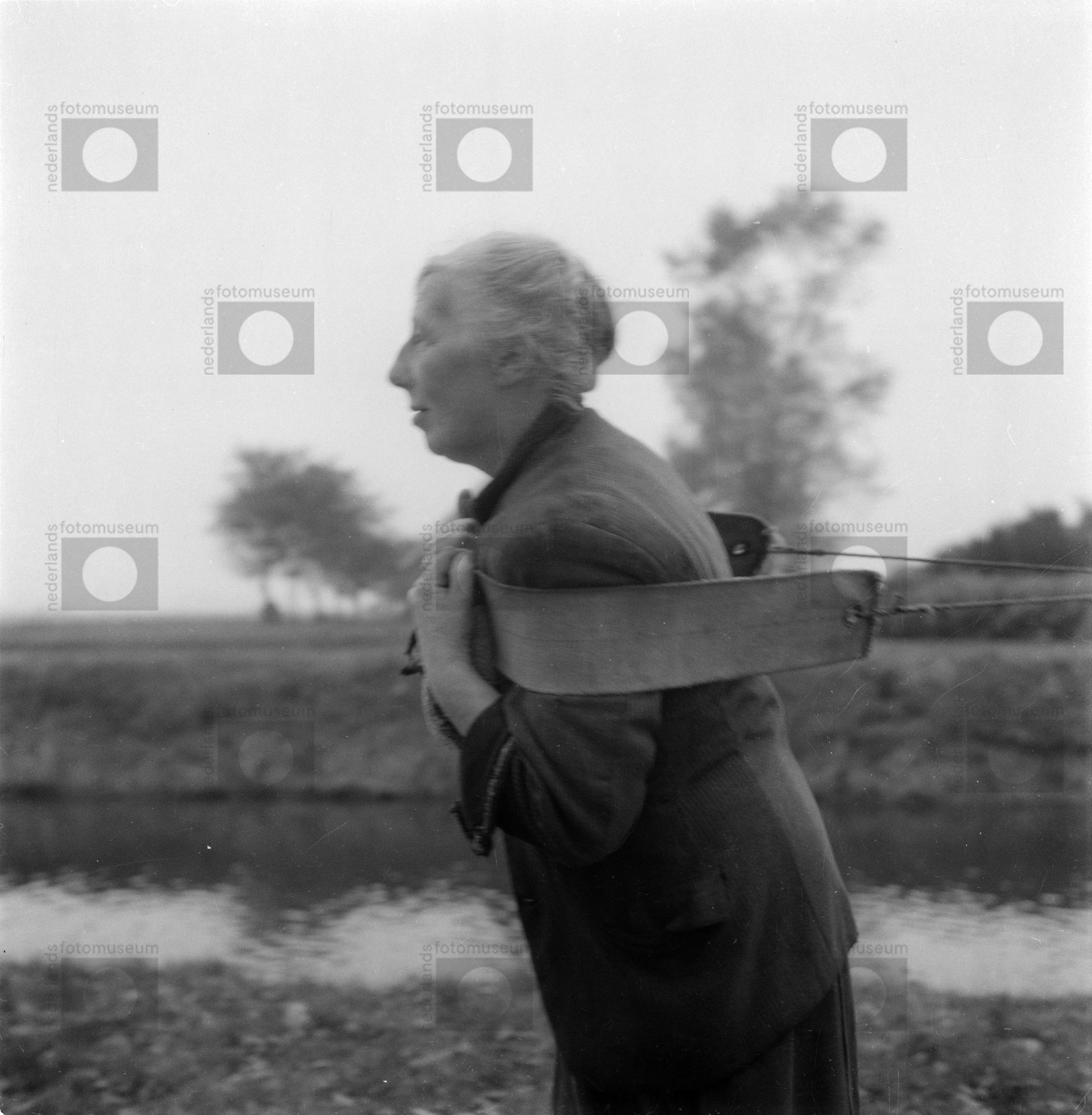 Schippersvrouw trekt schip in Hoogeveense vaart, Dre...