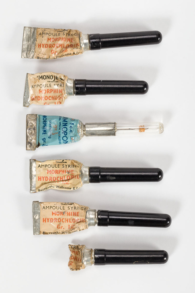 Zes lege morfinespuiten met dop voor eenmalig gebruik