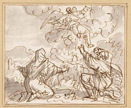 Manoach en zijn vrouw knielen bij het altaar waarbov...