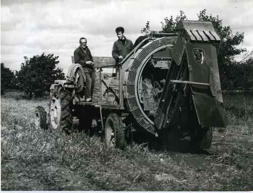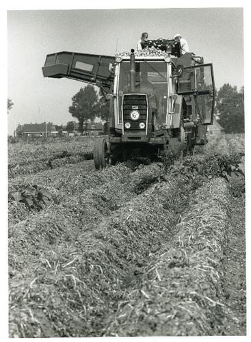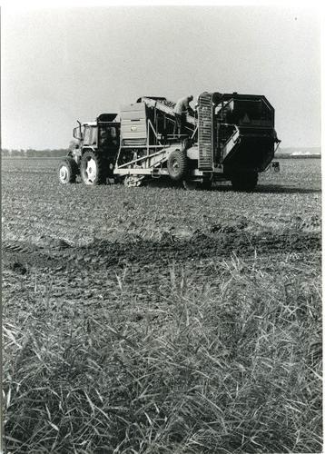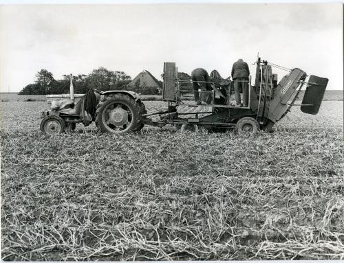 Foto in zwart-wit van het machinaal rooien van de aa...