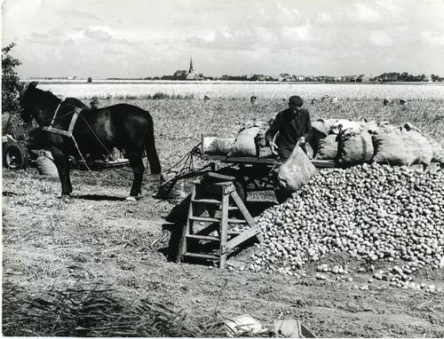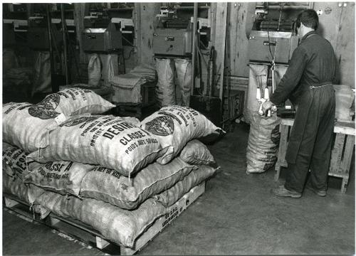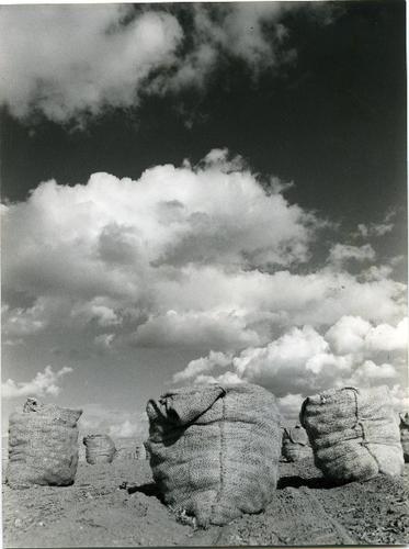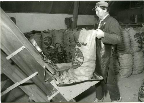 Foto in zwart-wit van het legen van zakken aardappel...