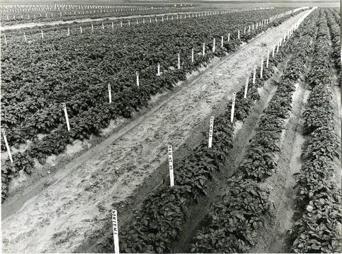 Foto in zwart-wit van een proefveld aardappelen door...