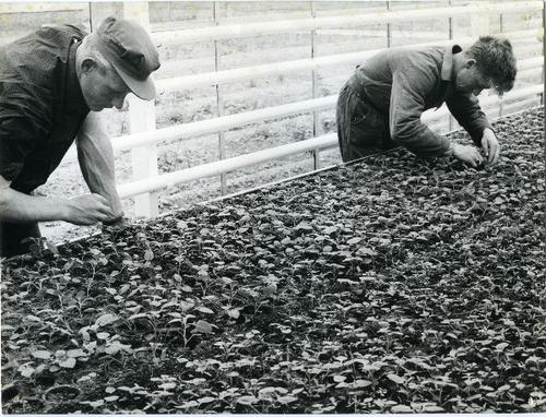 Foto in zwart-wit van het werk in de kassen bij kwee...