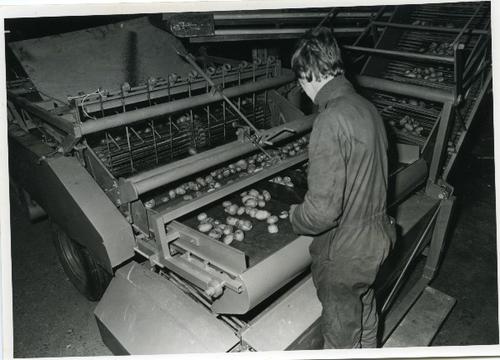 Foto in zwart-wit van een aardappelsorteermachine