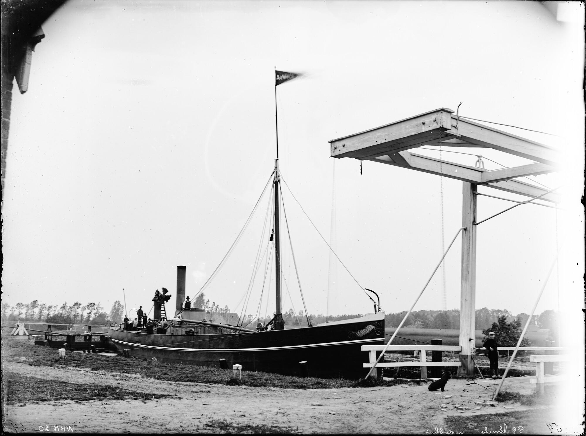 Het ss. Almelo I ligt afgemeerd in een sluis bij Almelo