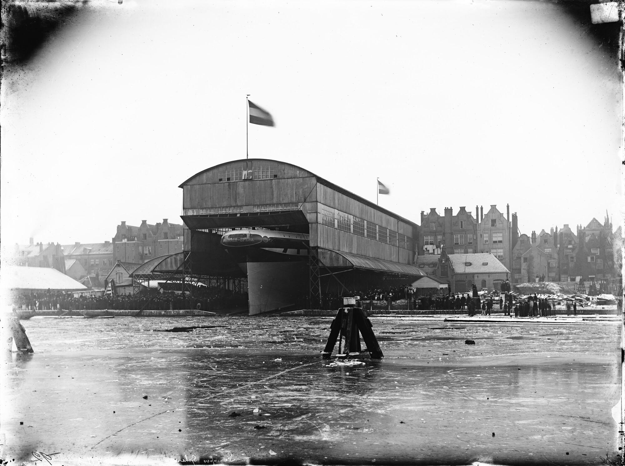 Het stalen barkschip Van Galen in aanbouw op de werf...