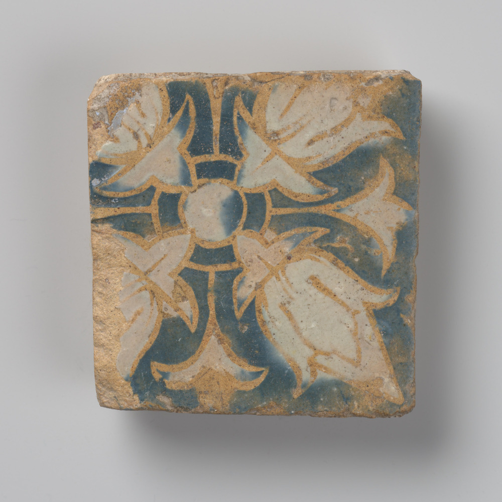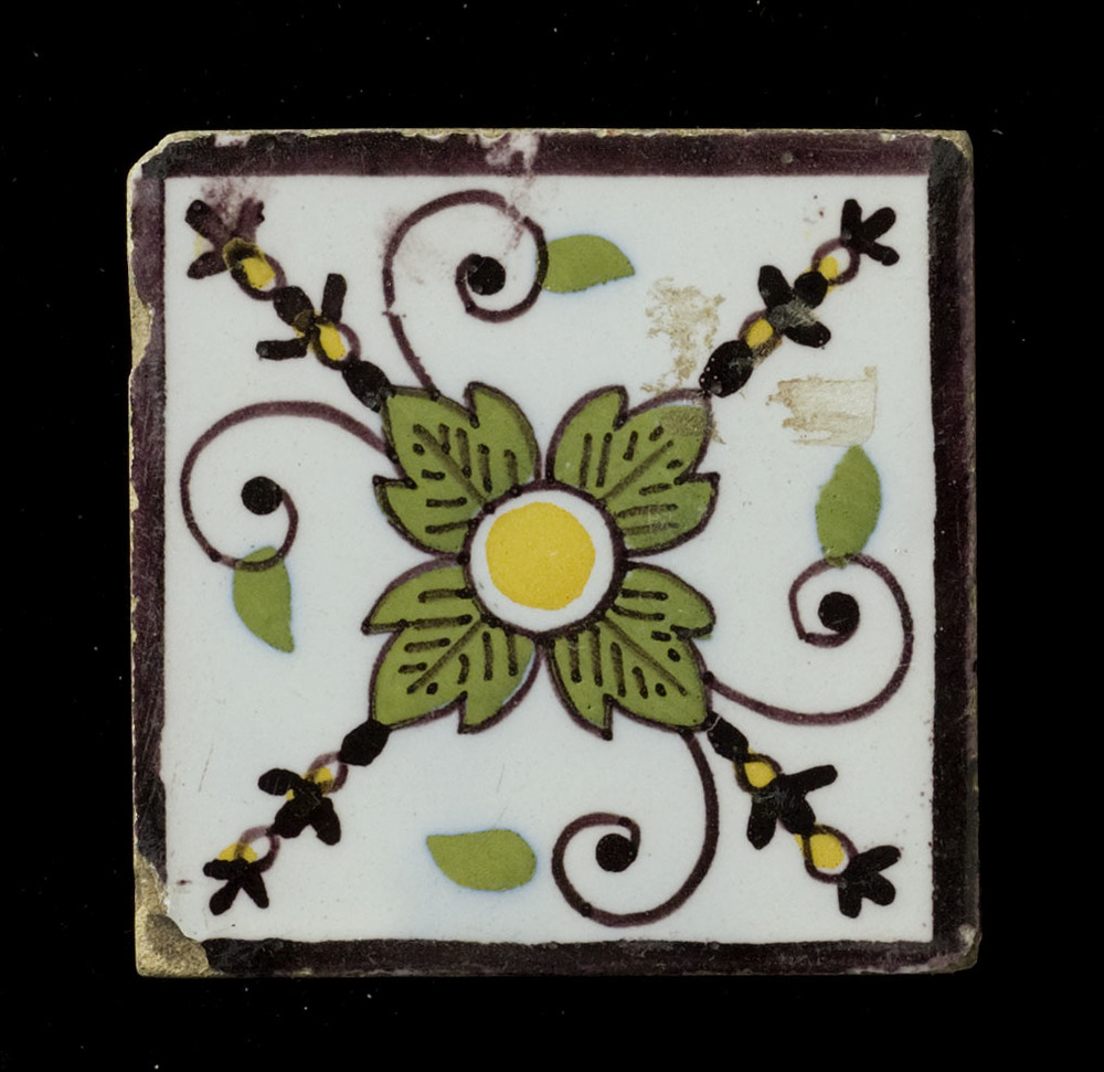 Tegel in zeefdruk, met voorstelling: tegelfragment m...