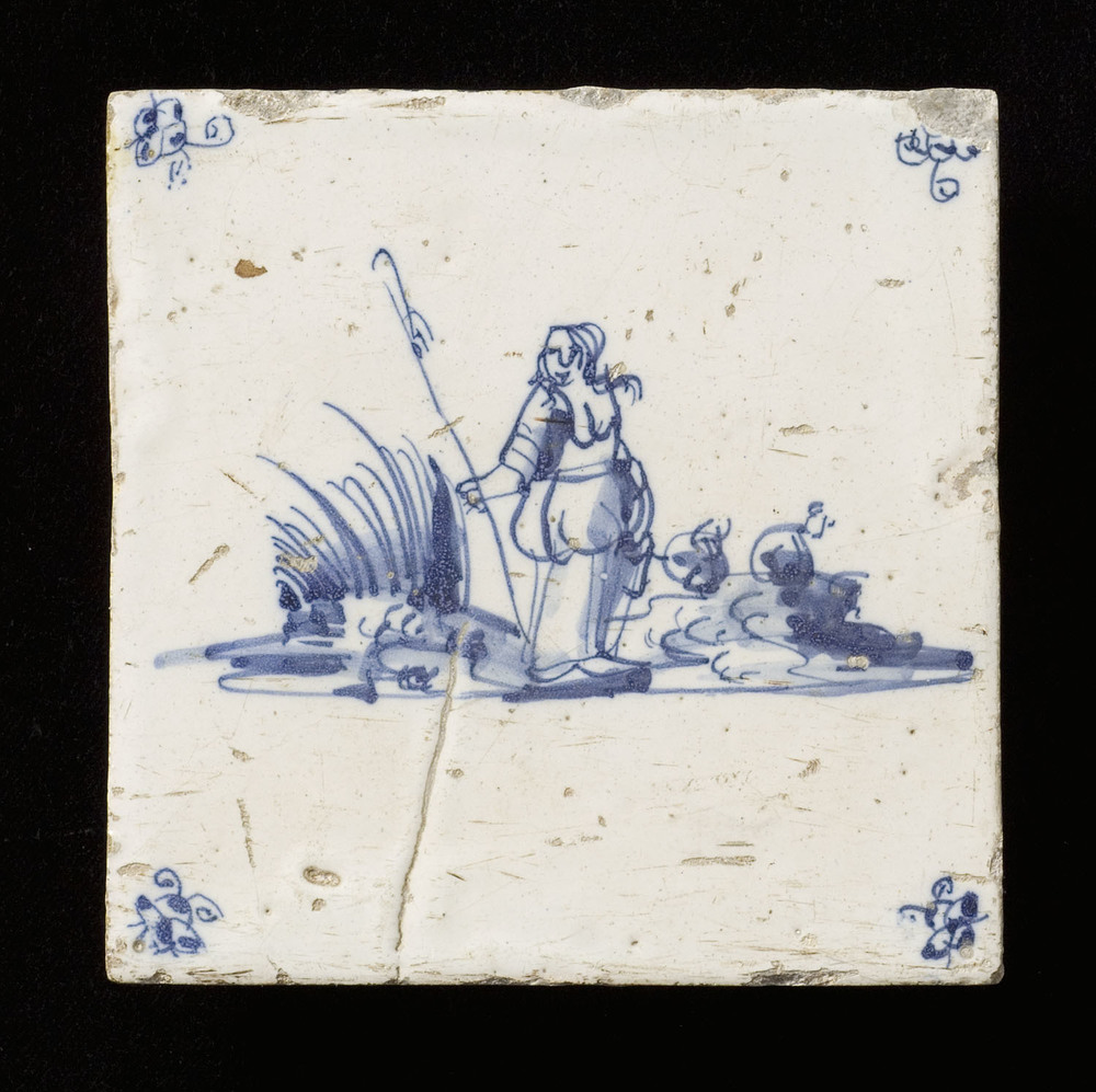 Tegel van keramiek, tinglazuur, voorstellende herder...