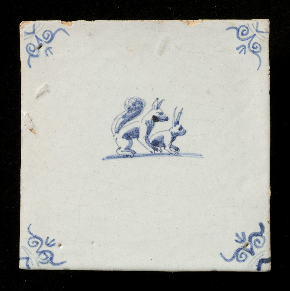 Tegel in tinglazuur, voorstellende haas en eekhoorn,...