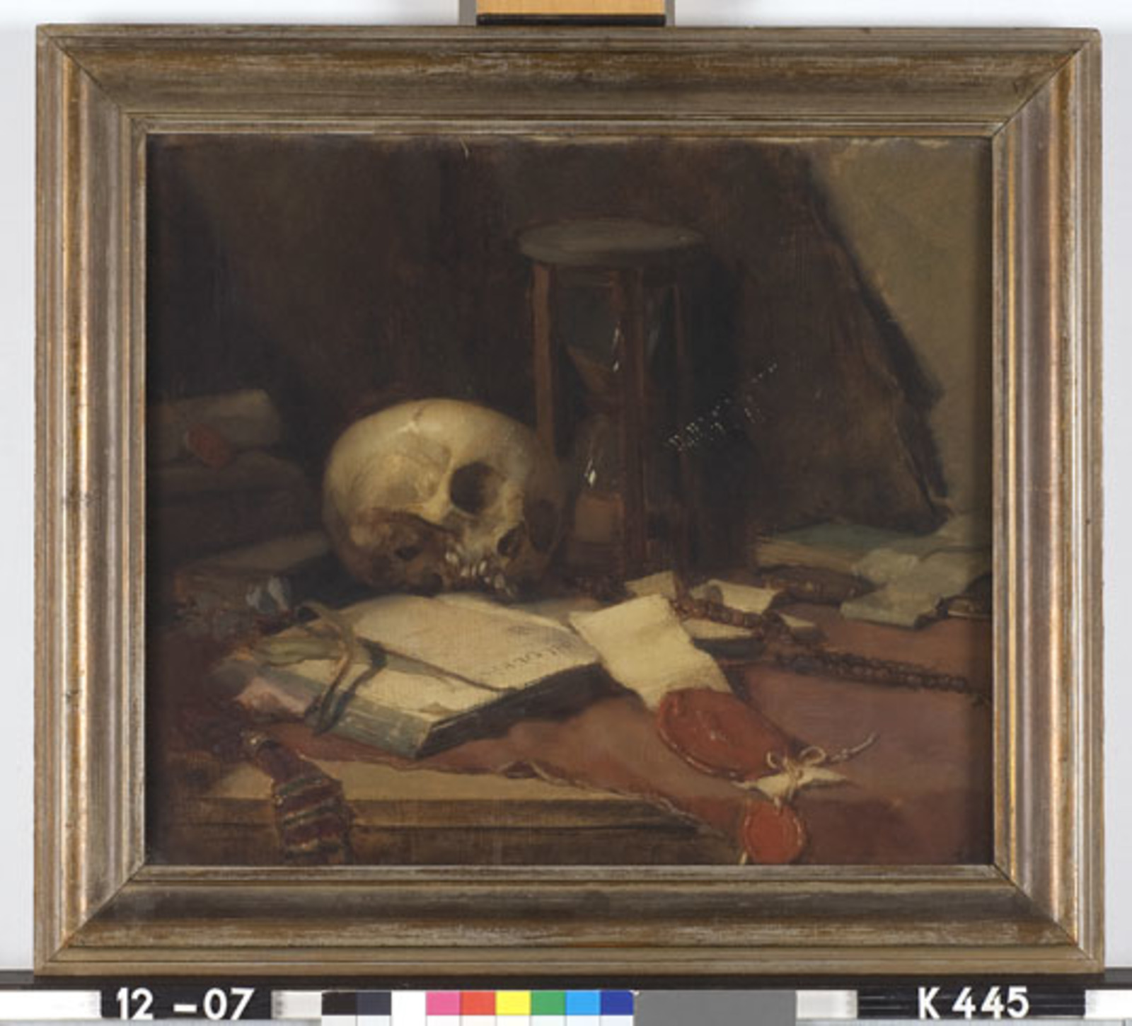 Stilleven met doodshoofd en zandloper