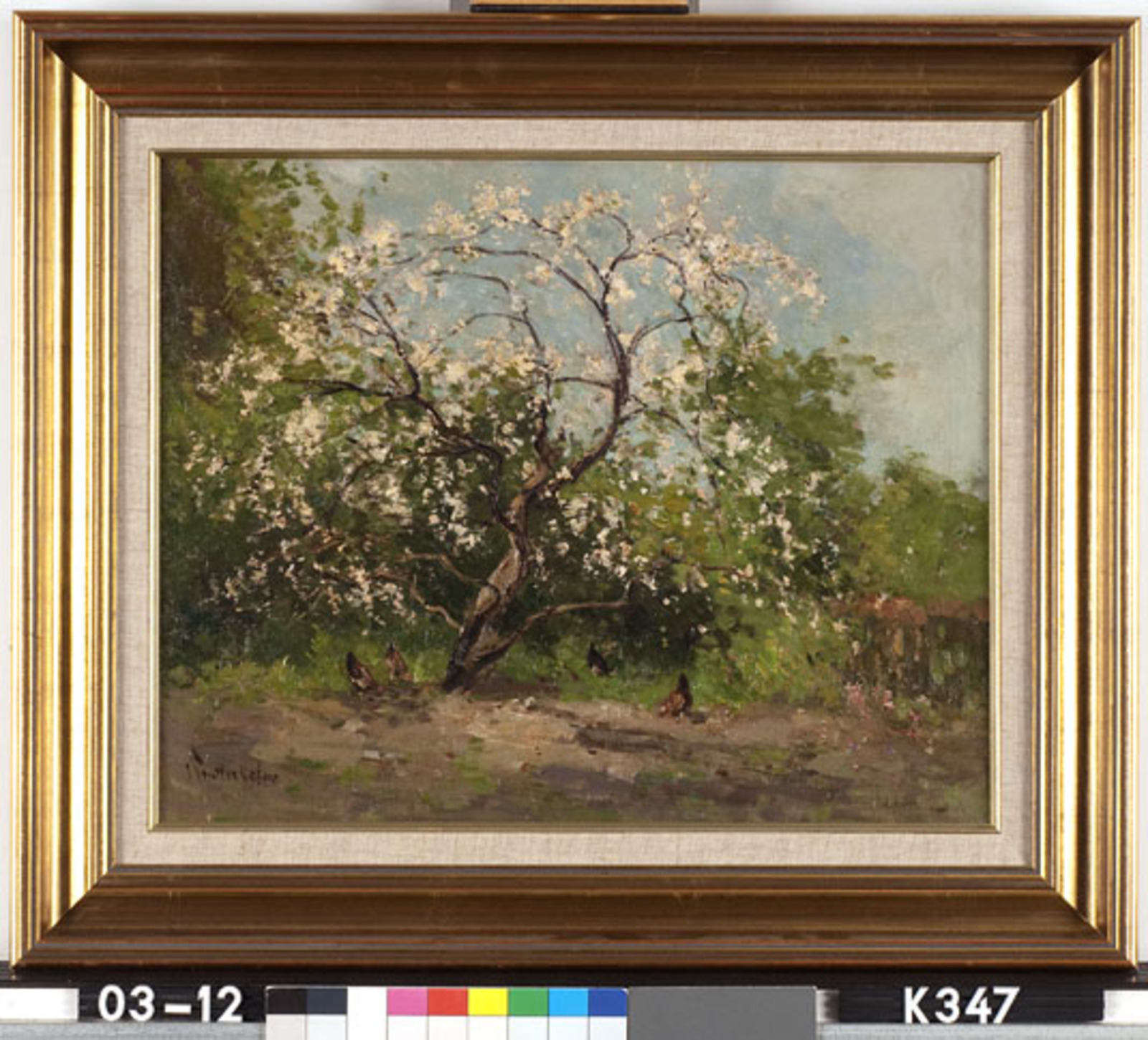Oude appelboom met kippen