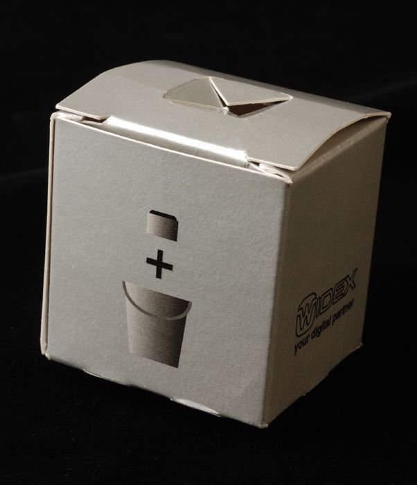 Kartonnen naaldencontainer met "WIDEX / your digital...
