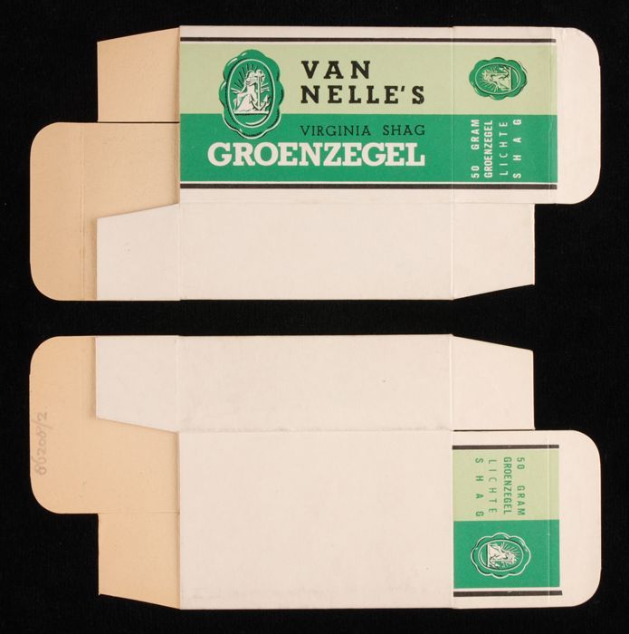 Plat gevouwen, witte doos met groene opdruk VAN NELL...