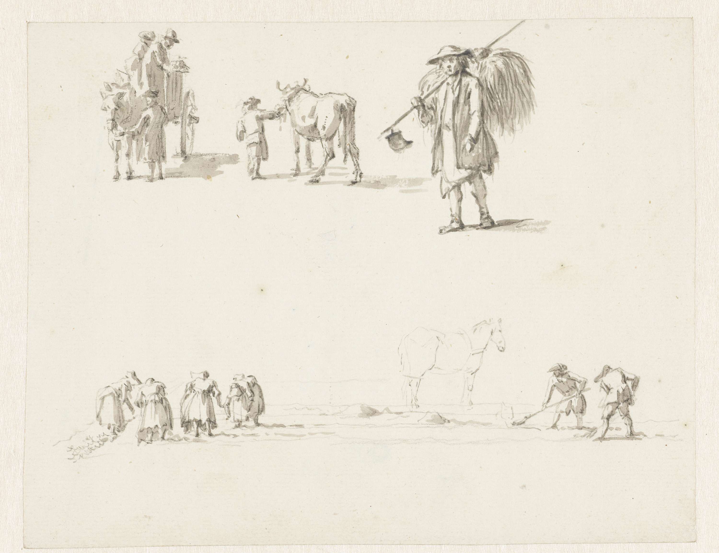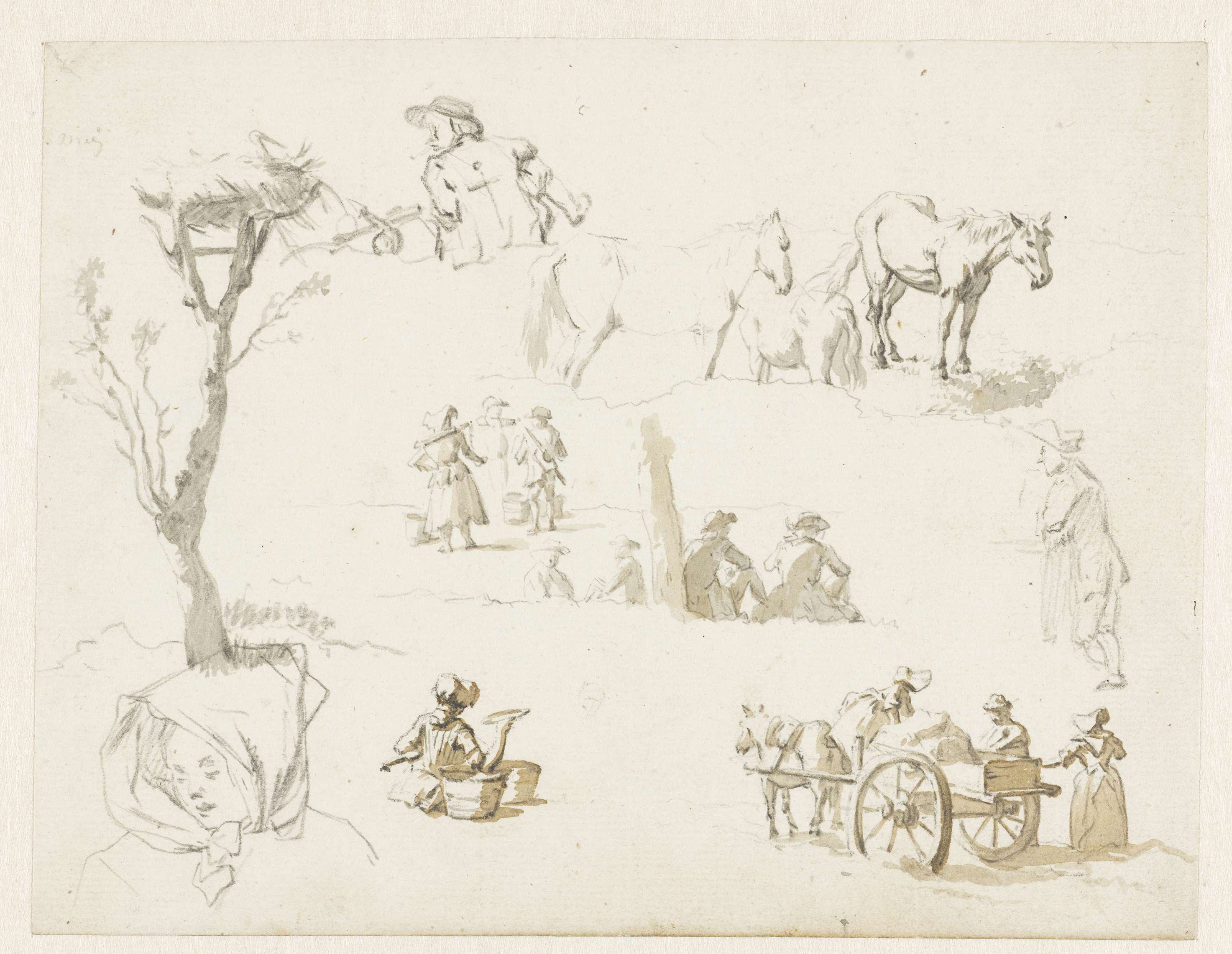 Studies van landlieden, paarden en een ooievaarsnest