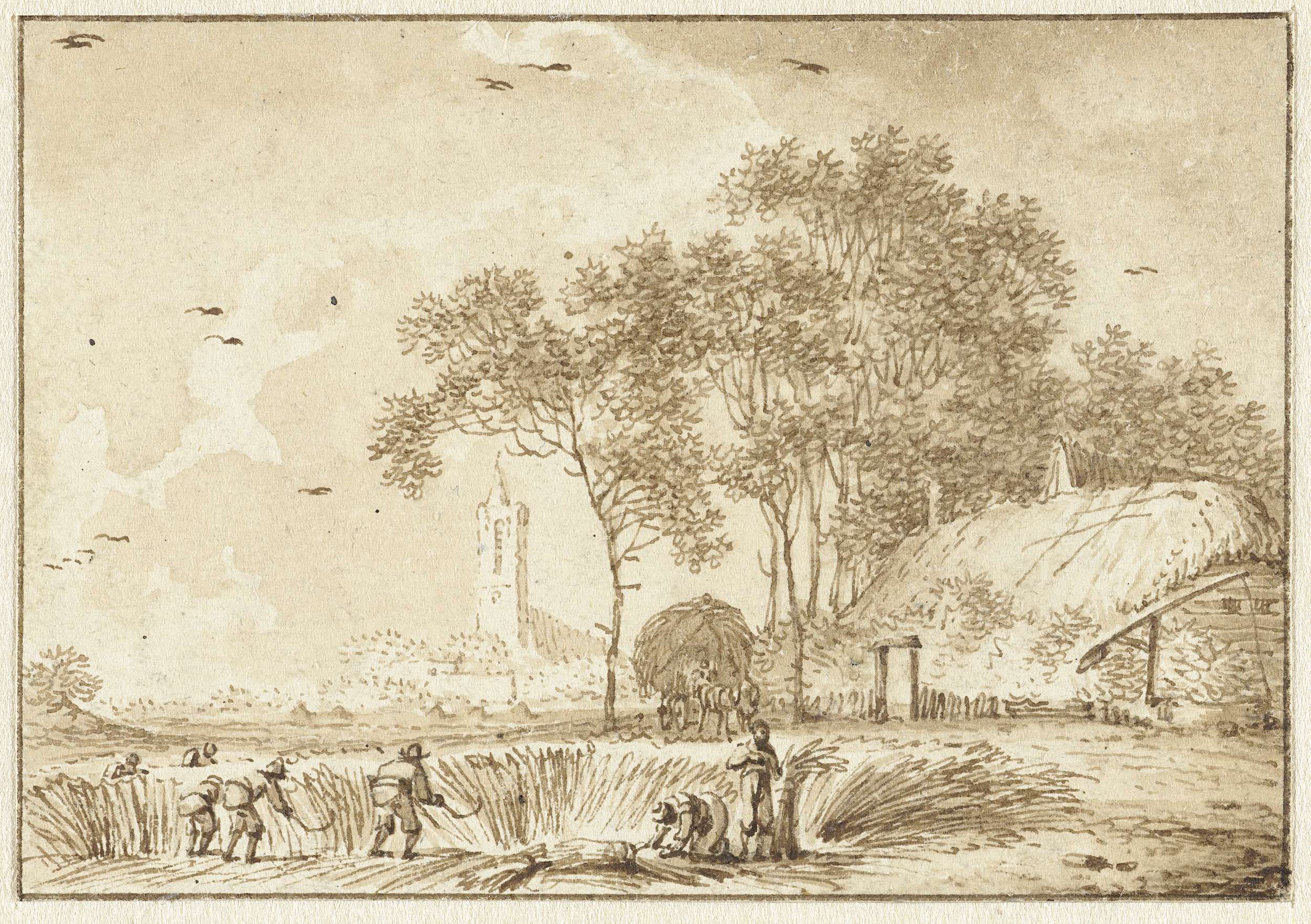 Maaiers bij een boerenhoeve