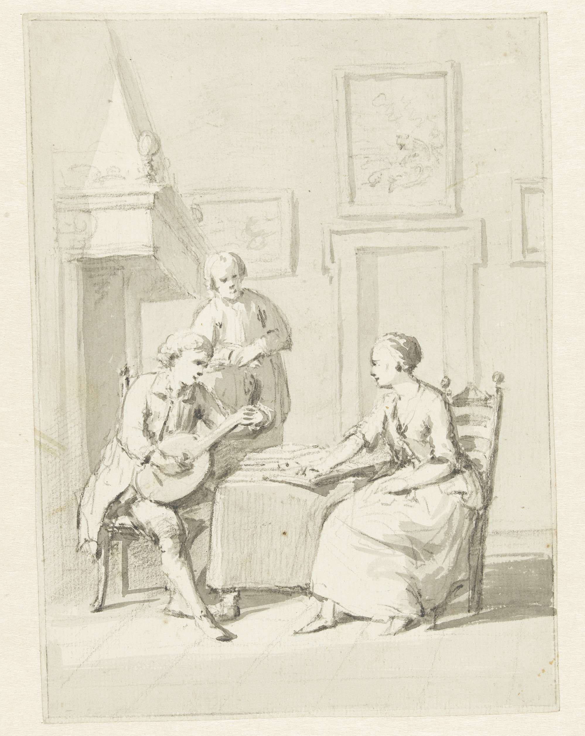 Interieur met luitspeler, zittende vrouw en staande man