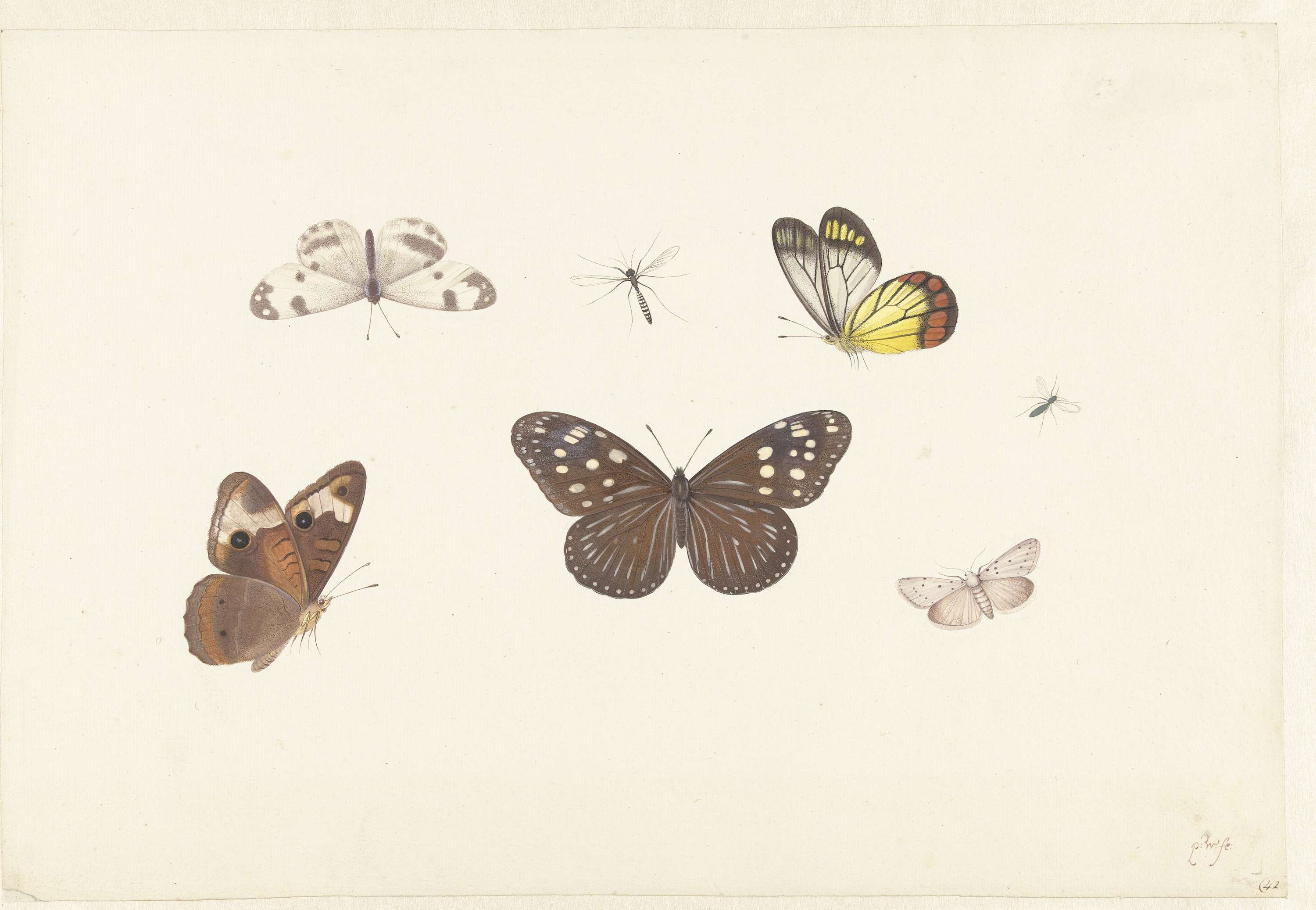 Blad met vijf vlinders en twee vliegen