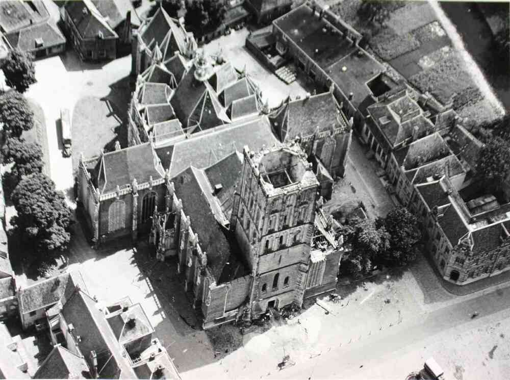 Luchtfoto van de Sint Walburgiskerk met afgebrande t...