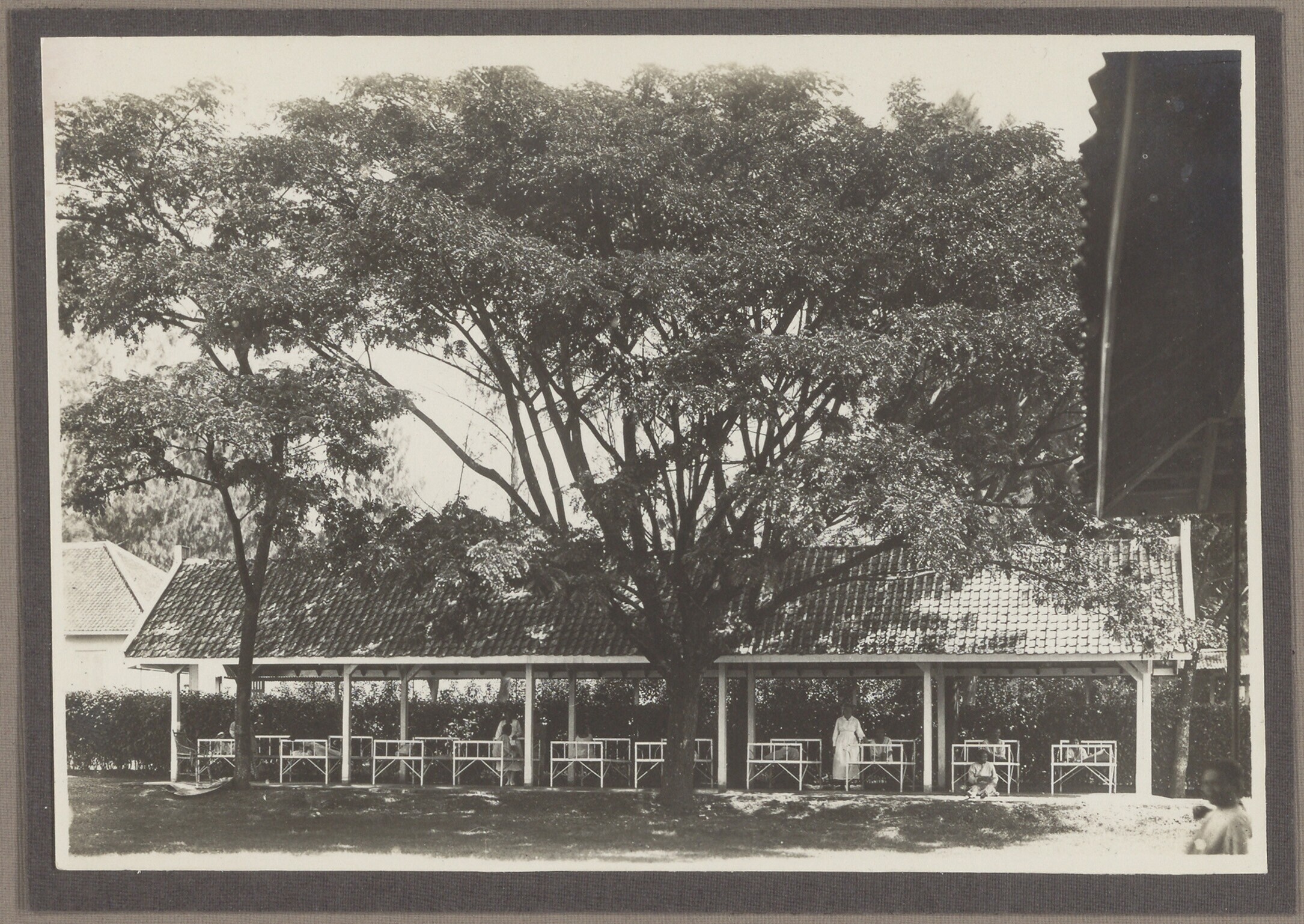 Een buitenzaal met bedden waar zieken worden verpleegd