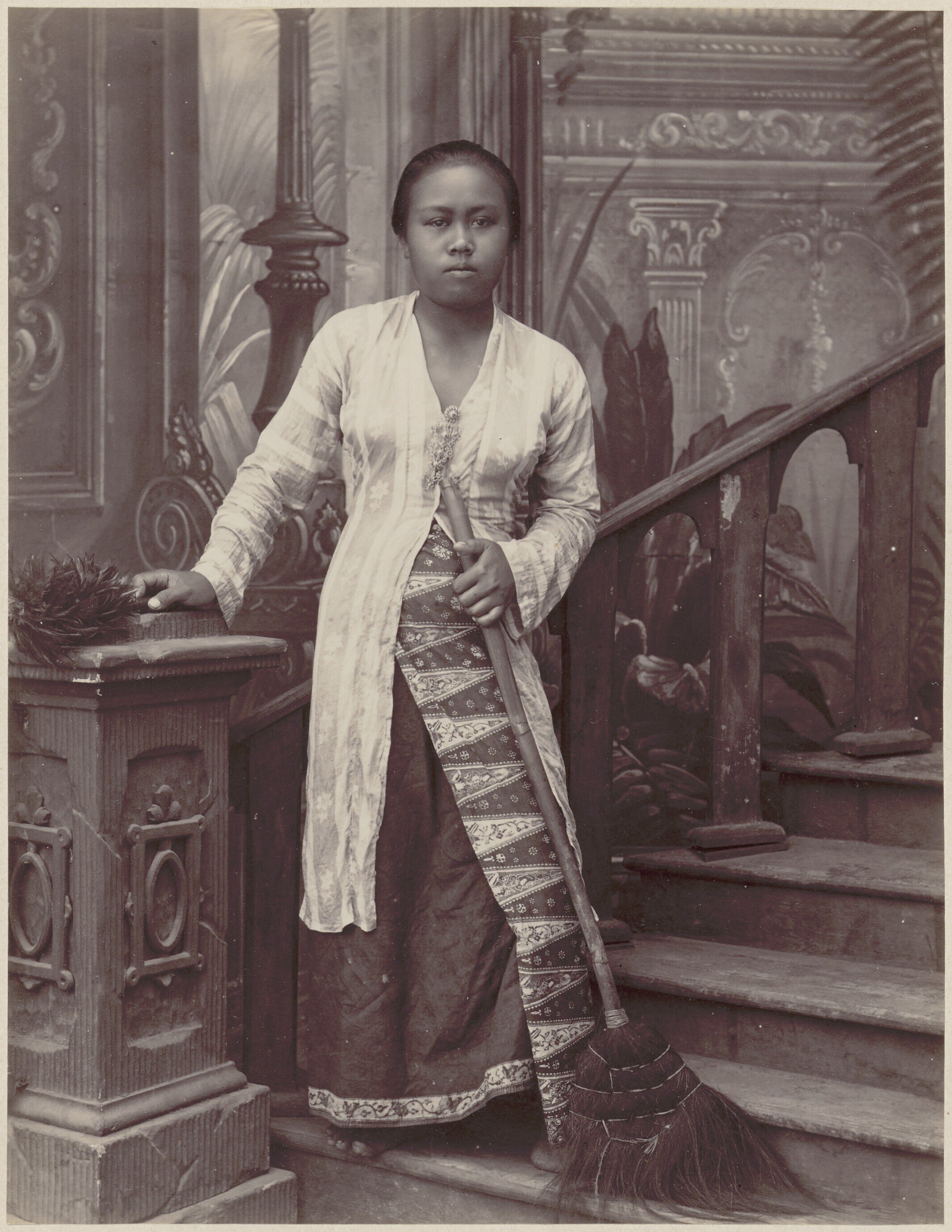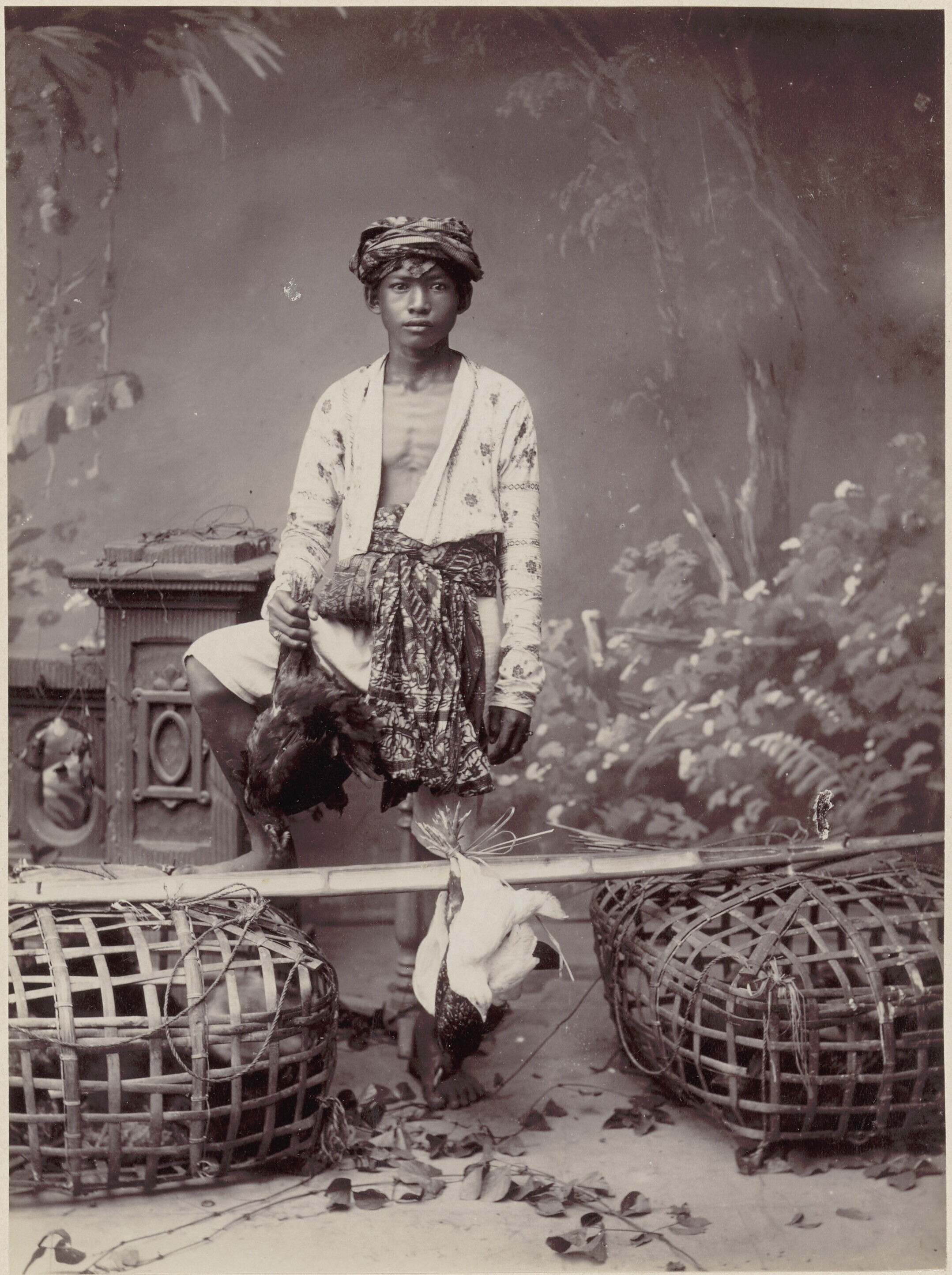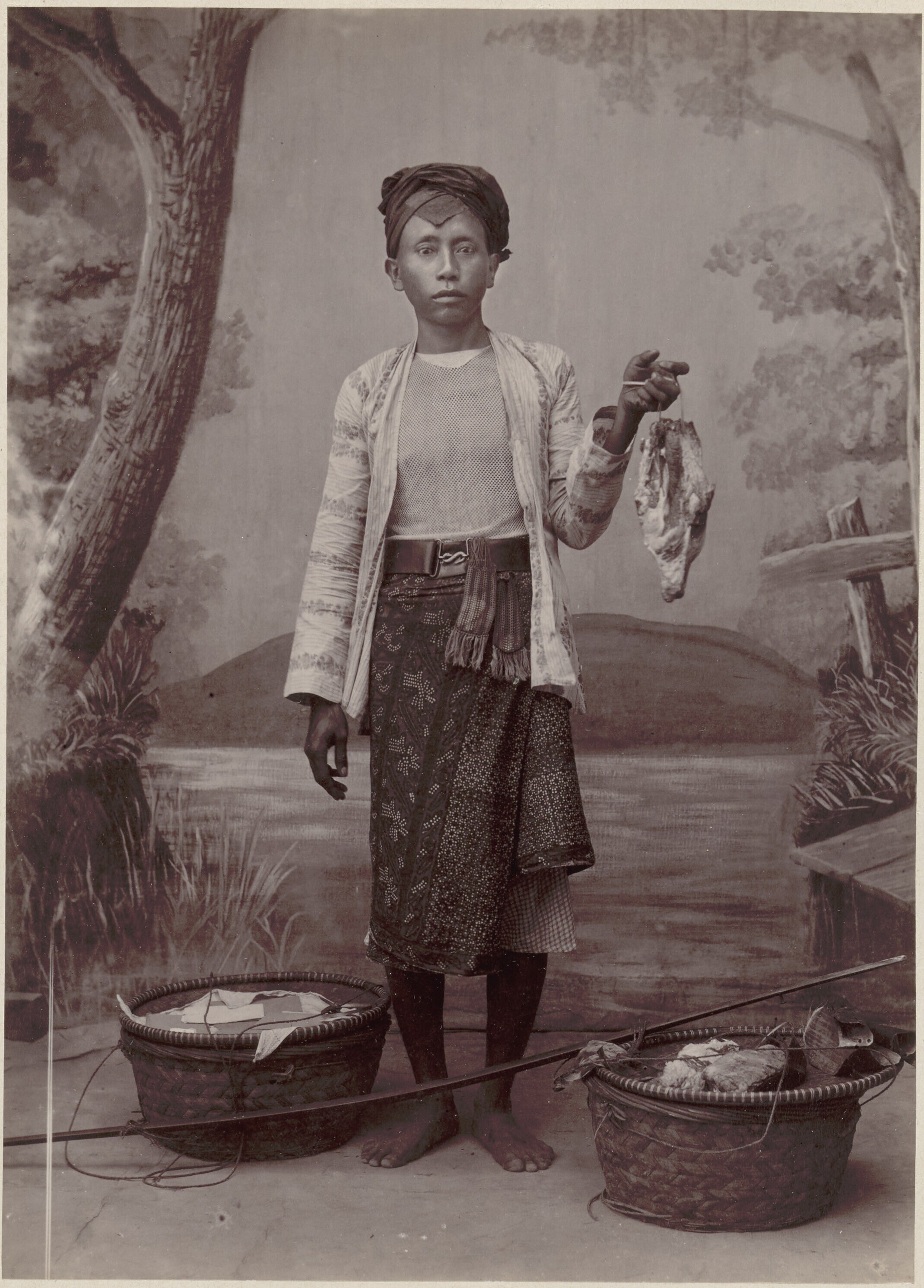 Studioportret van een vleesverkoper in Batavia