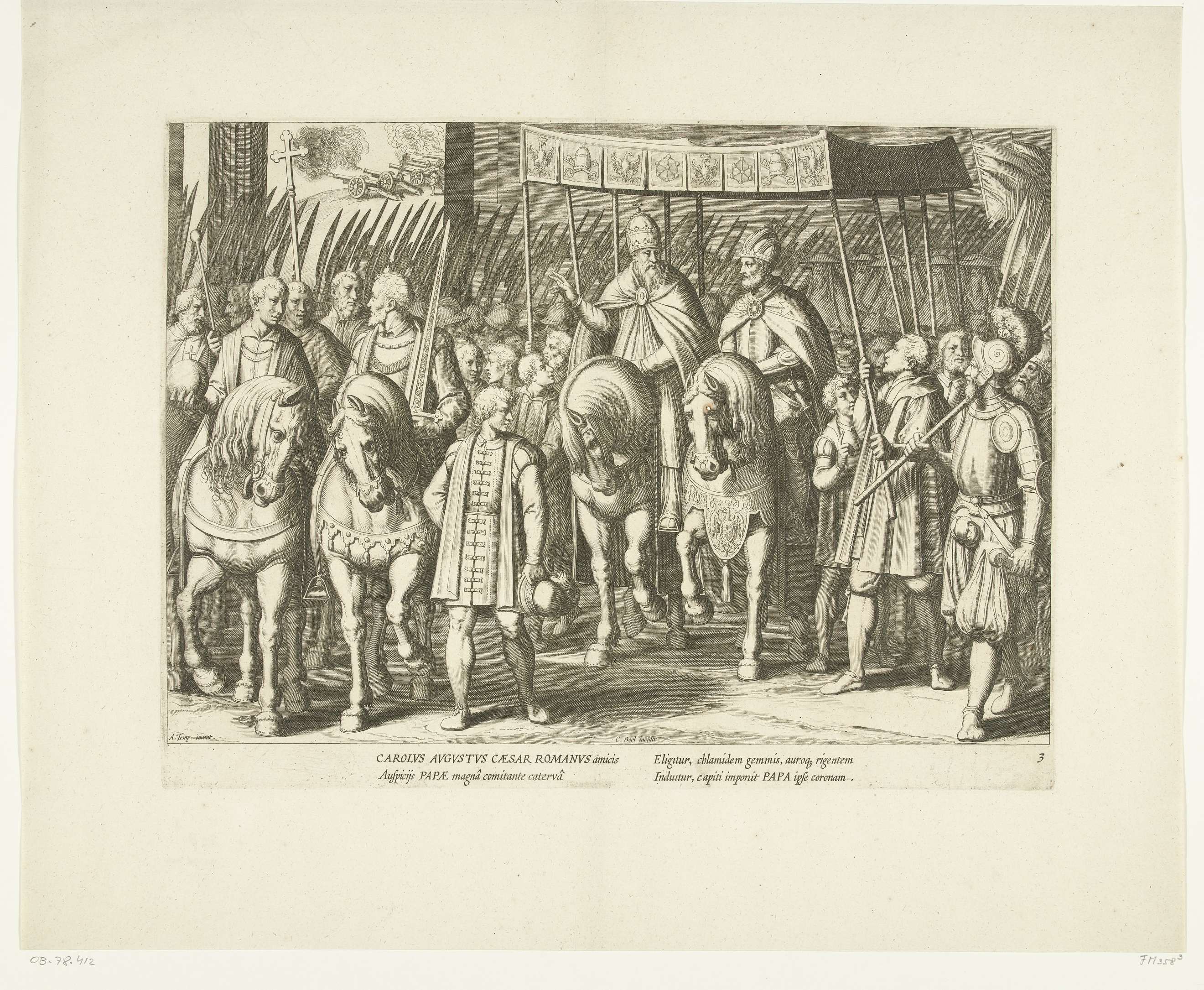 Optocht van keizer Karel V met de paus bij de kronin...
