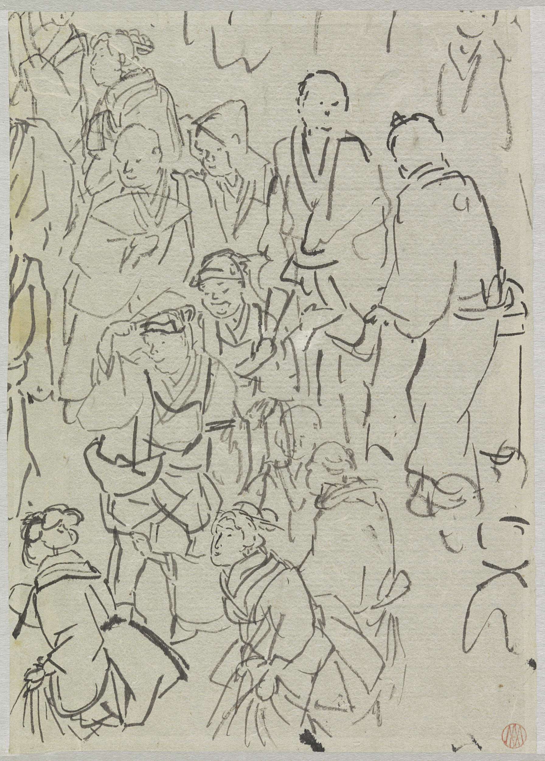 Schetsblad met studies van koppen en twee mannen ver...