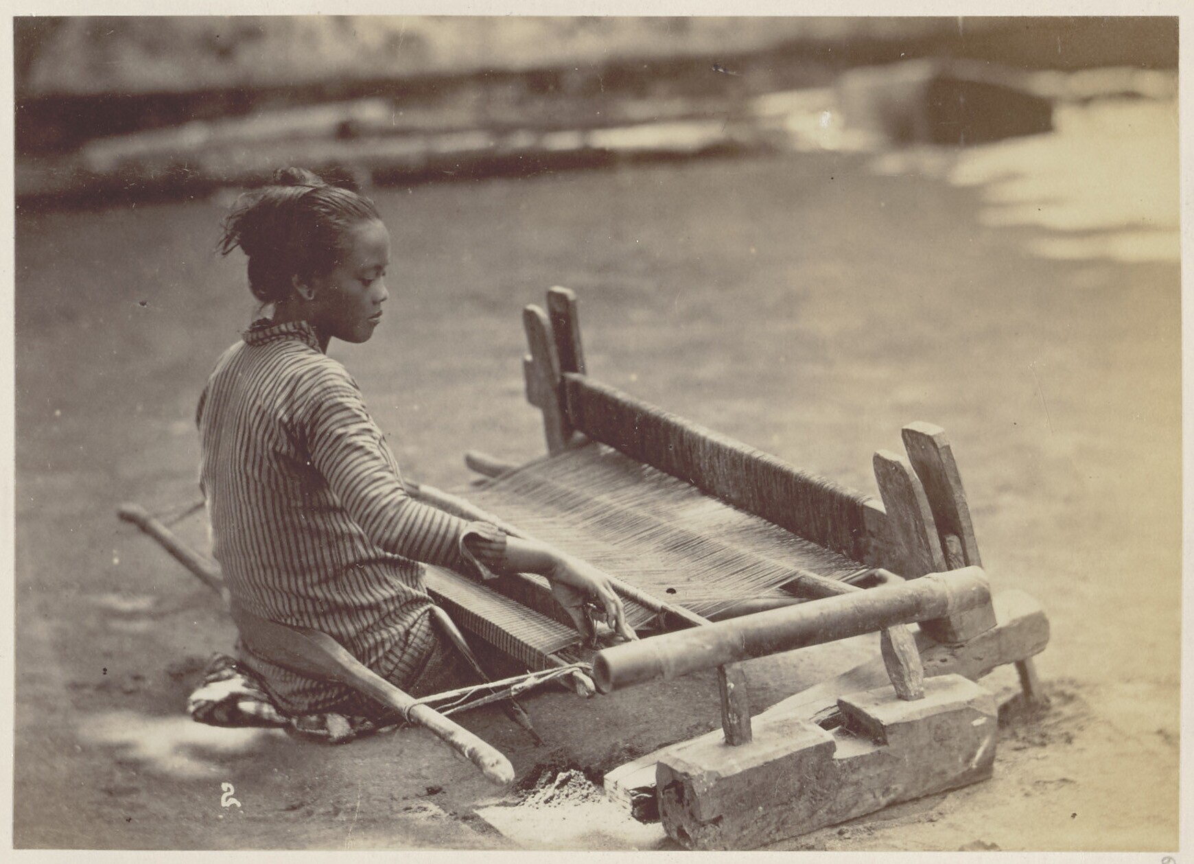 Een Javaanse vrouw bezig met het weven van een doek ...