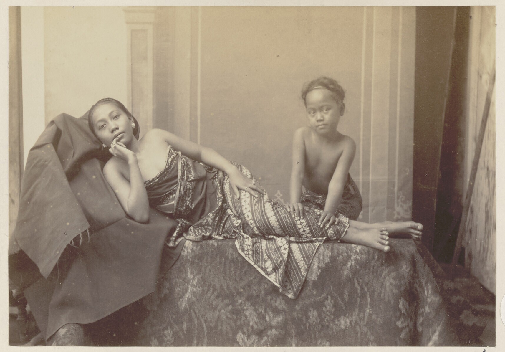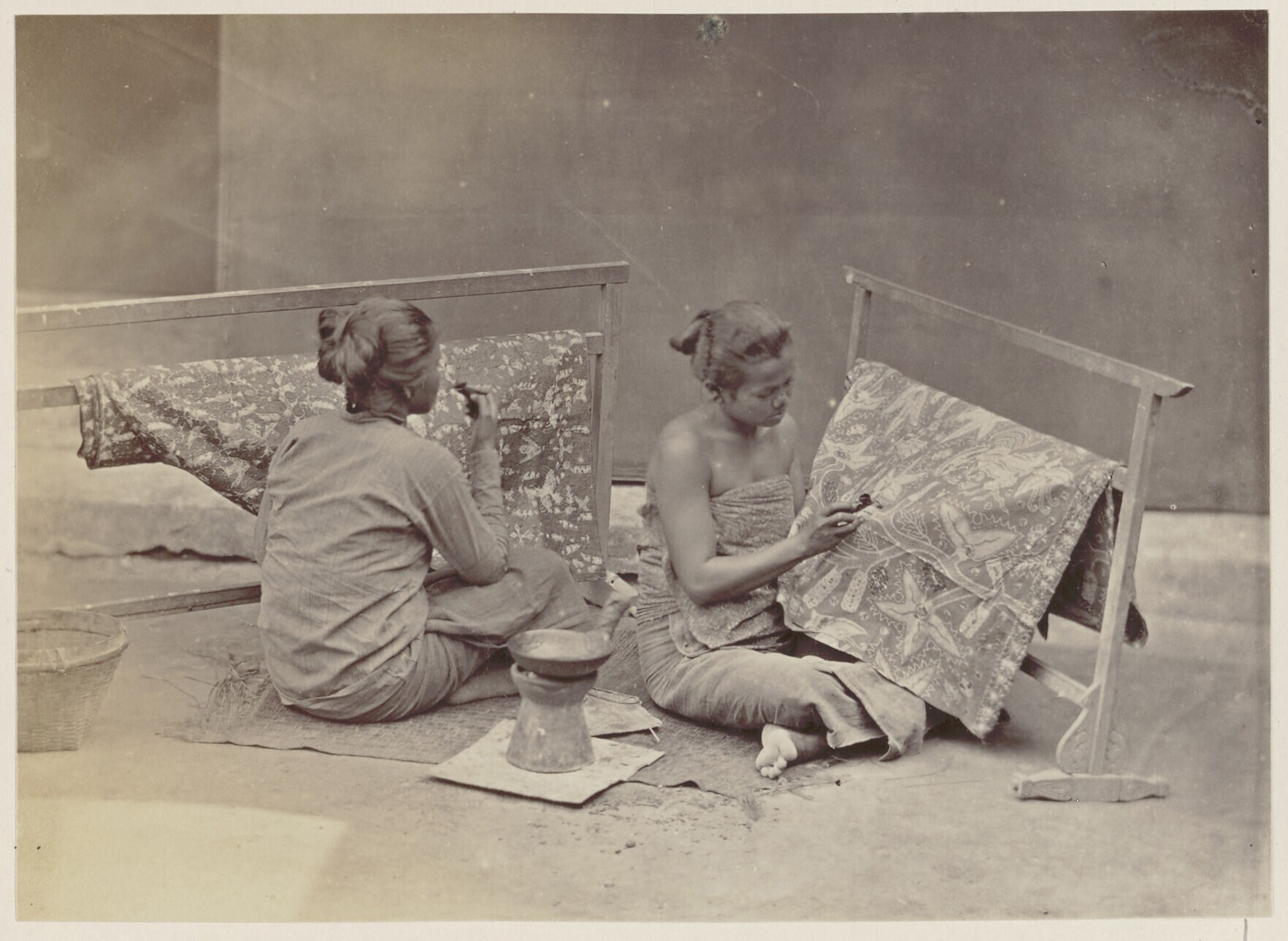Twee Javaanse vrouwen bezig met het batikken van doeken