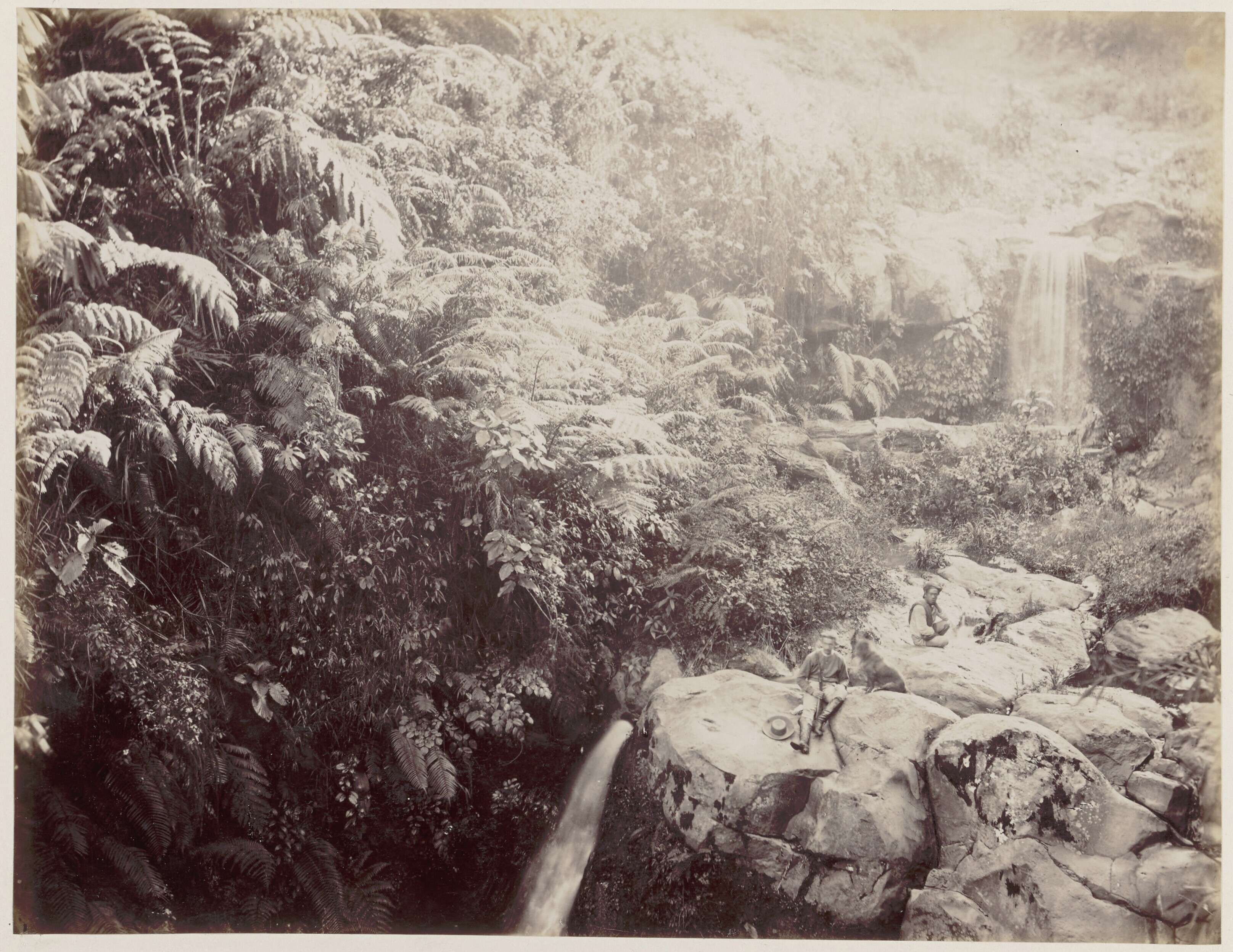Europeaan met hond en geweer bij een waterval in de ...