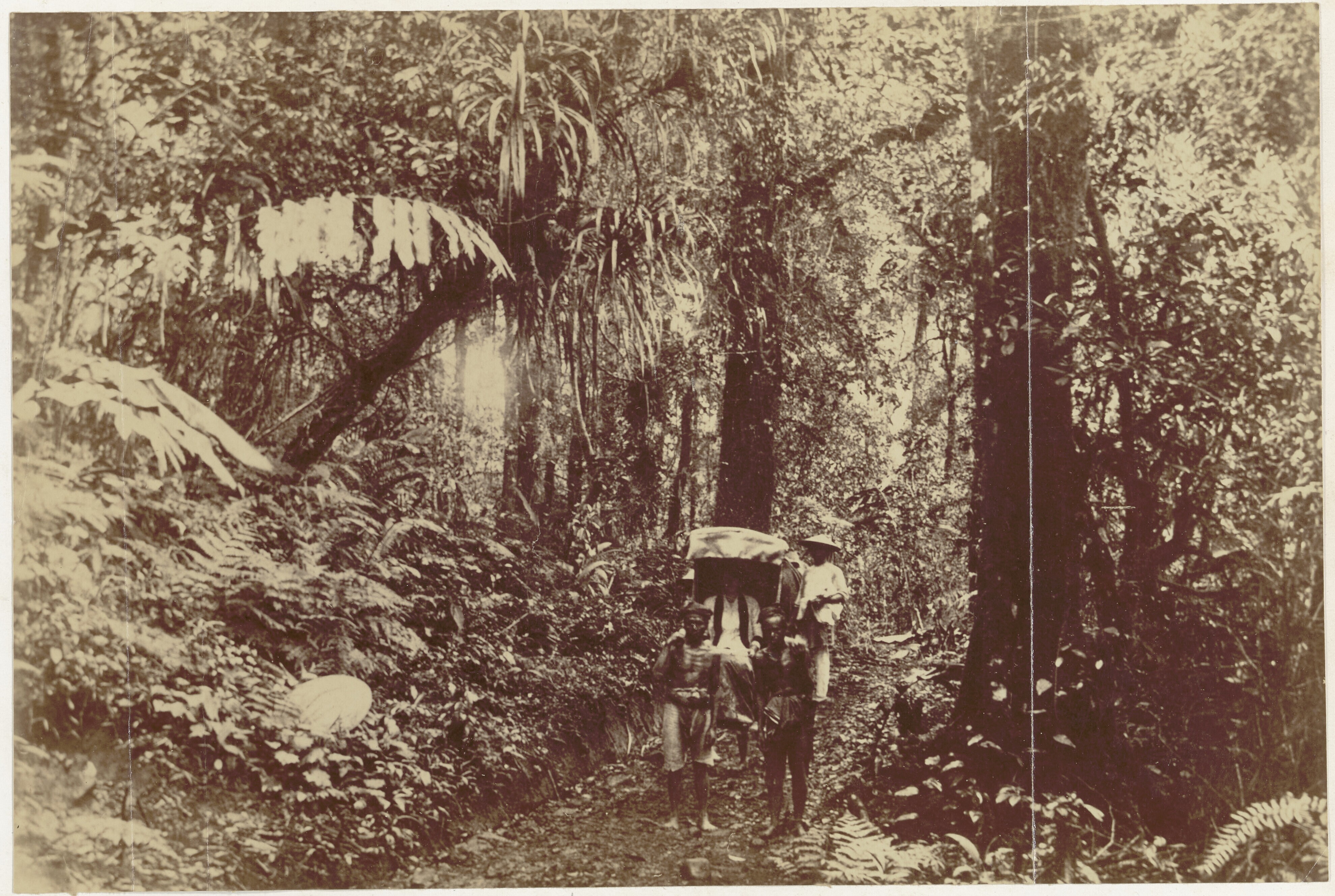 Transport per draagstoel in een bos in de Preanger